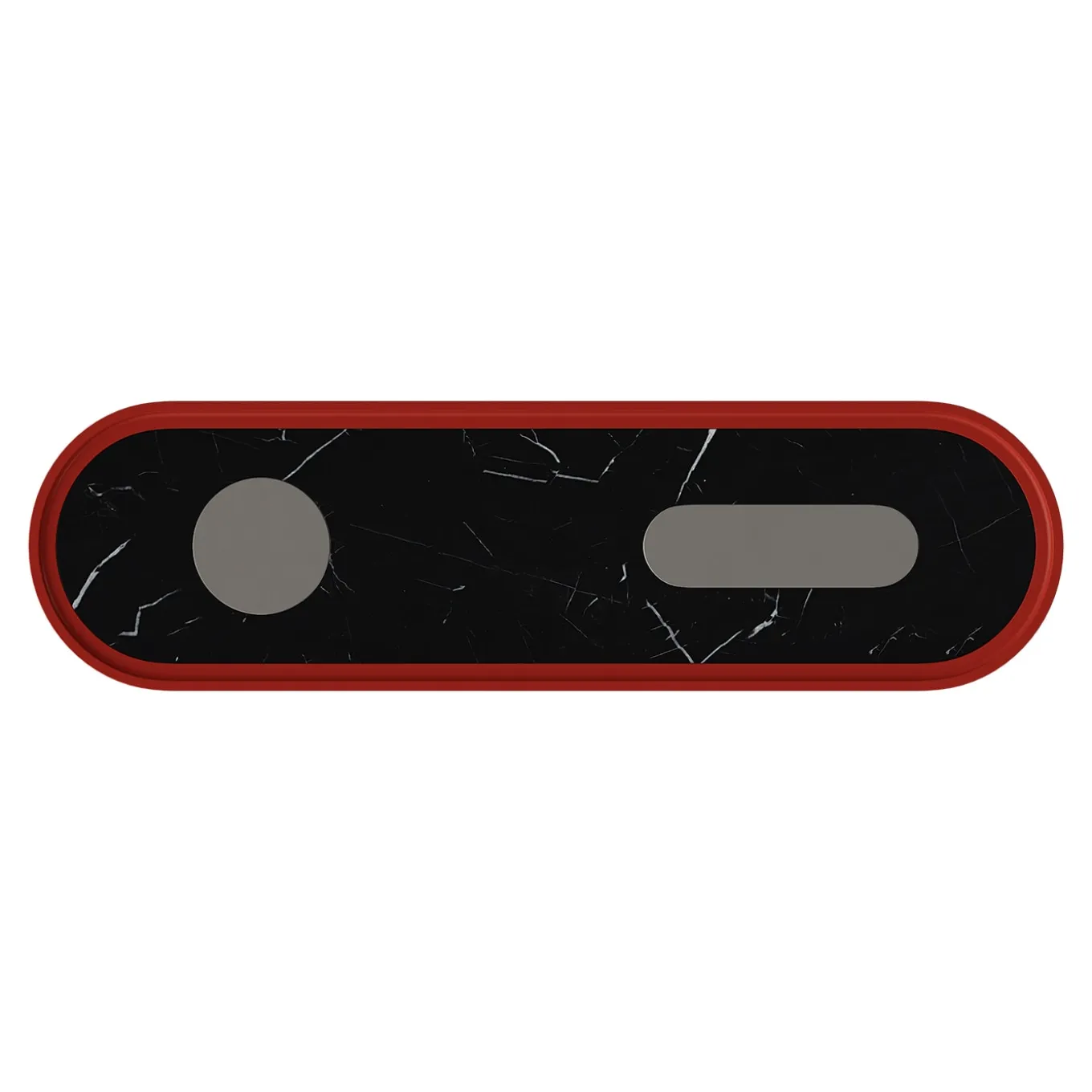 Part of the Creta series, this console is fully lacquered in a matte R/coral red finish with one round and one oval leg. The shaped top is enriched with a black Marquinia marble insert and some satin inox details.