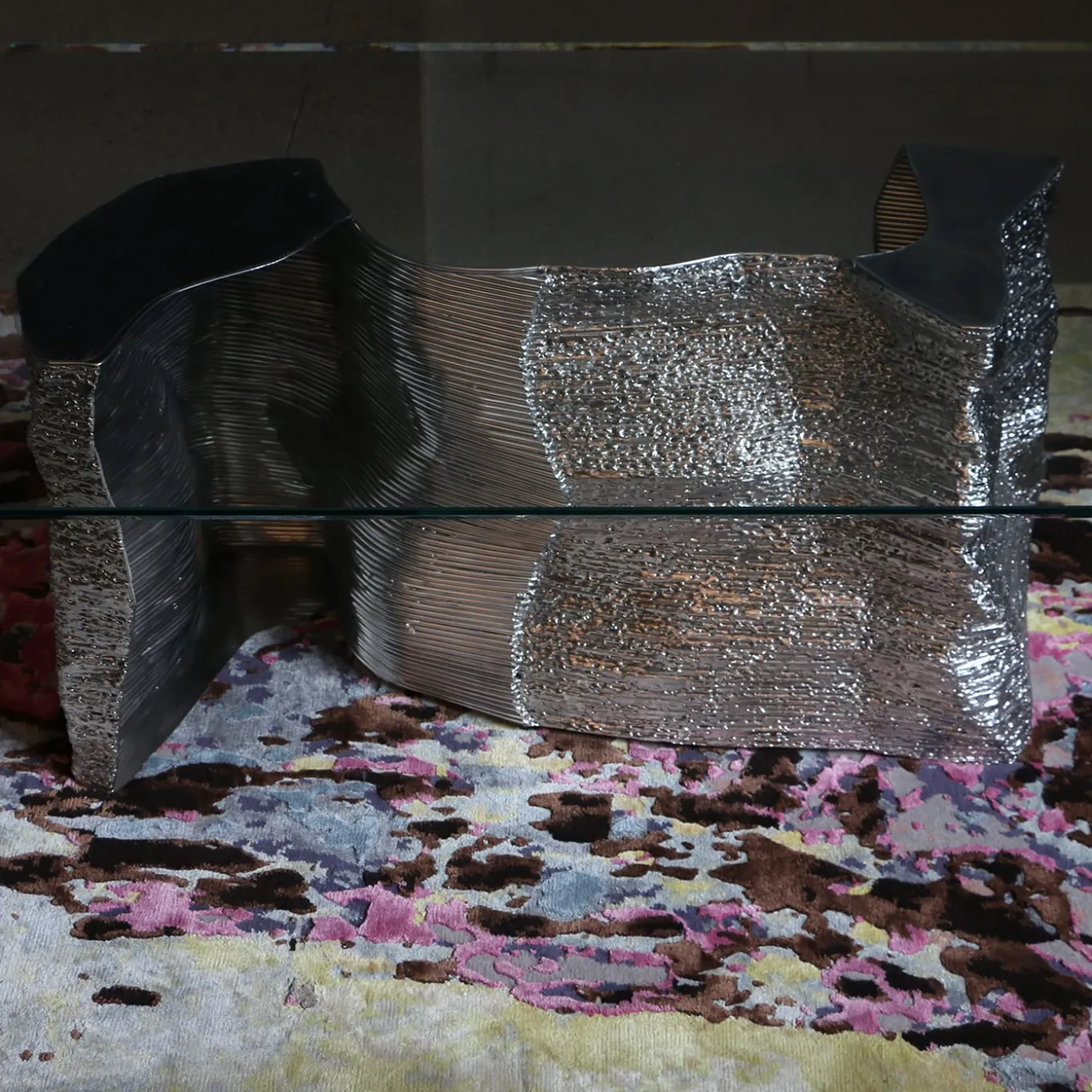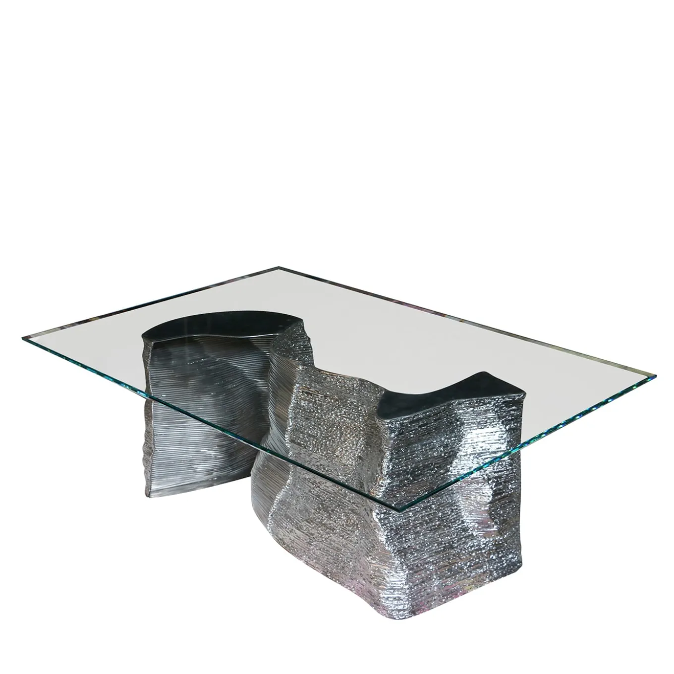 The Cristallo Coffee Table from a series of numbered and customizable, exclusive designs by Giò Pozzi is distinguished by a clear crystal top that allows one to see through and admire the strikingly handcrafted steel base, sculpted with traditional techniques of craftsmanship. It is a veritable work of art that will be a stately accent piece in a contemporary interior. Unique steel processing technique: bent, hand-welded and polished. Please ask the Concierge for customization options.