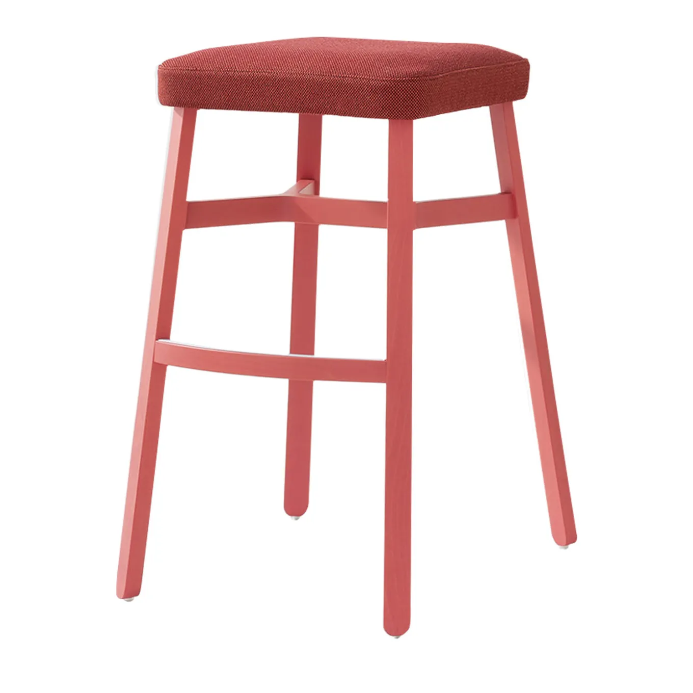This superb stool by Emilio Nanni balances the liveliness of vibrant colors with an exquisitely modern aesthetic. Showcasing the distinctive trait of the Croissant Collection – the structural crossing under the seat – this piece features a slender silhouette in red-tinted beech comprising four slanted, flattened legs that sustain he squared seat upholstered in vivid red-hued fabric. Contract and commercial certifications available upon request.