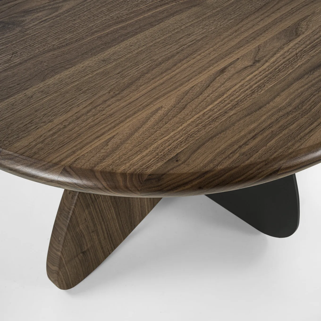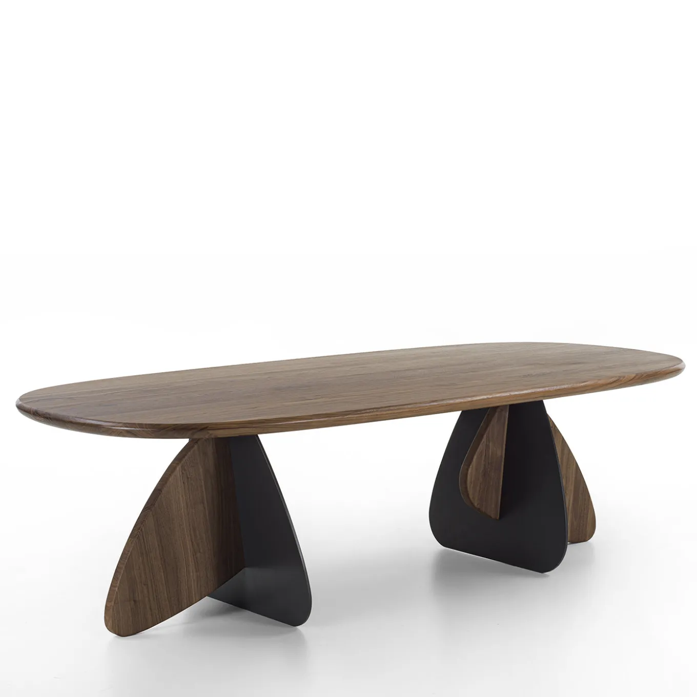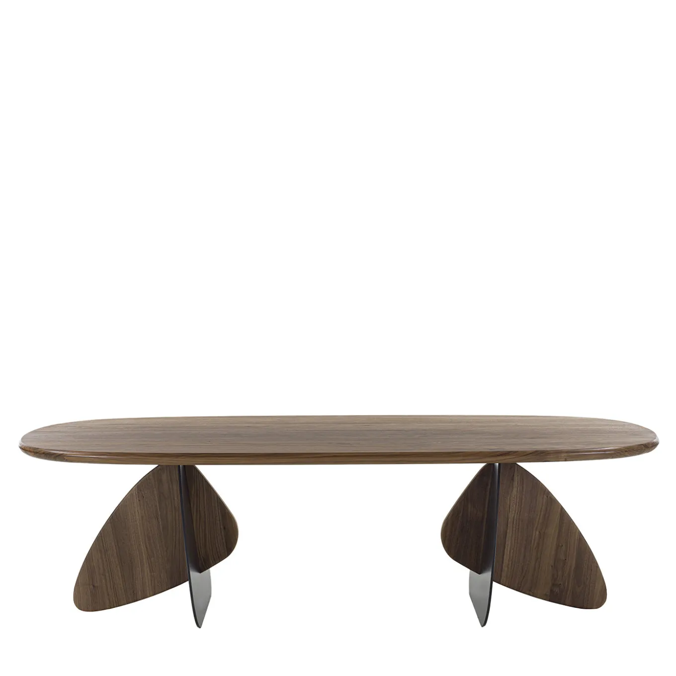 The Cross dining table features a top crafted from knot-free walnut with a smooth oil finish and softly rounded edges. The base combines iron and walnut volumes with curved shapes that intersect, creating a natural-inspired cross pattern. The iron base is finished in a textured Irondust lacquer. Designed by Carlesi Tonelli, this table offers a unique blend of organic form and industrial detail suitable for contemporary dining spaces.