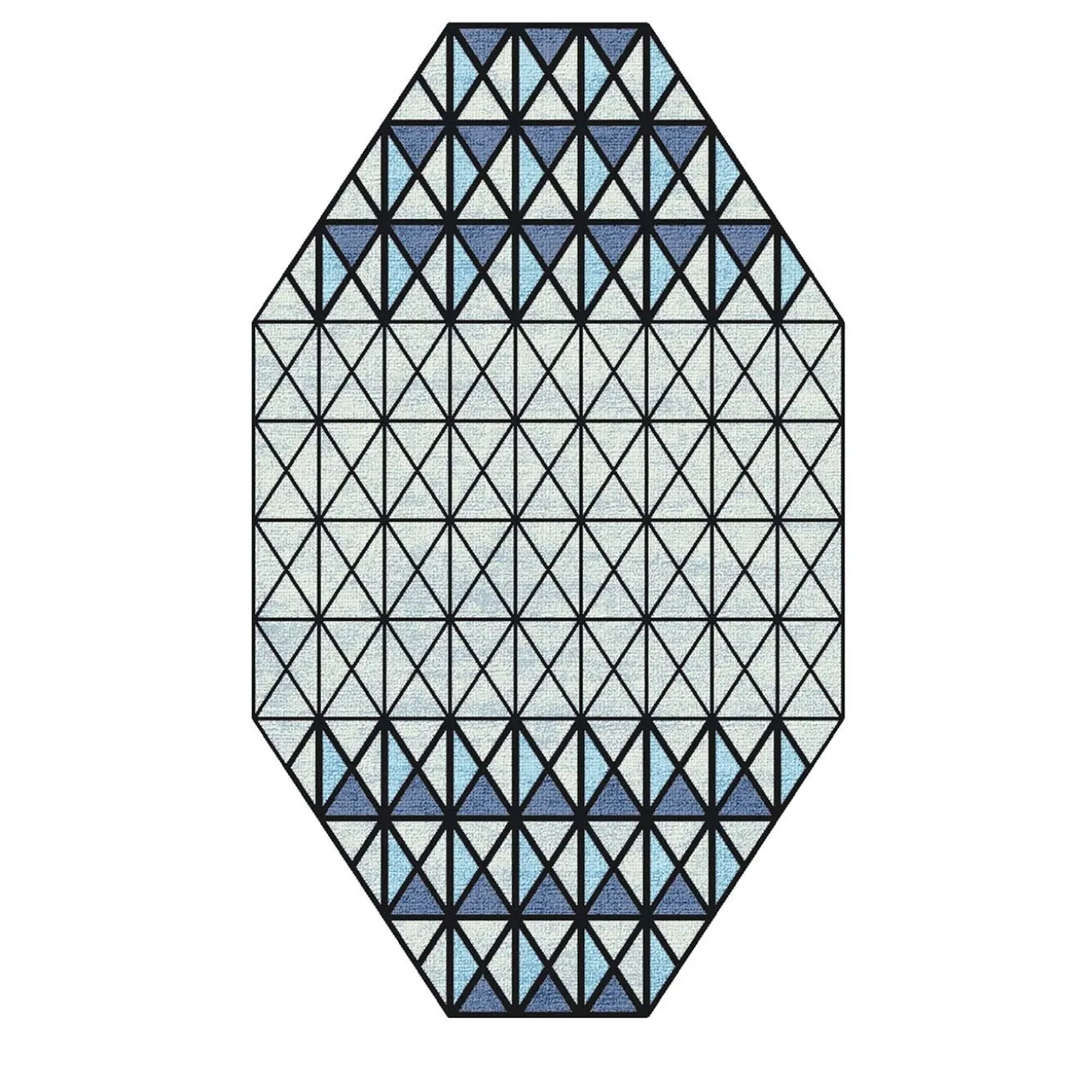 This special geometrical wool and viscose rug is handknotted into rectangular and triangular forms that form an overall stretched octagonal shape. The rug makes an impression for its understated and cooling beige and light and dark blue colors. Sure to make an impression on any home or office floor.