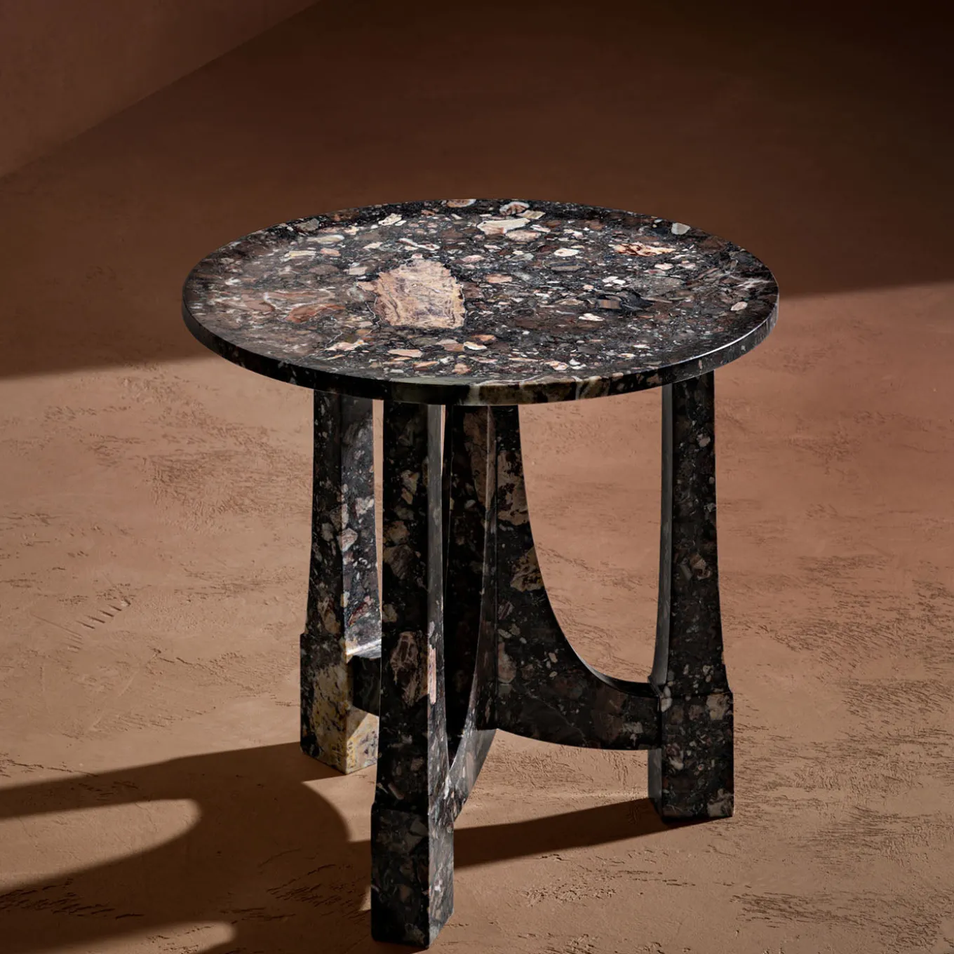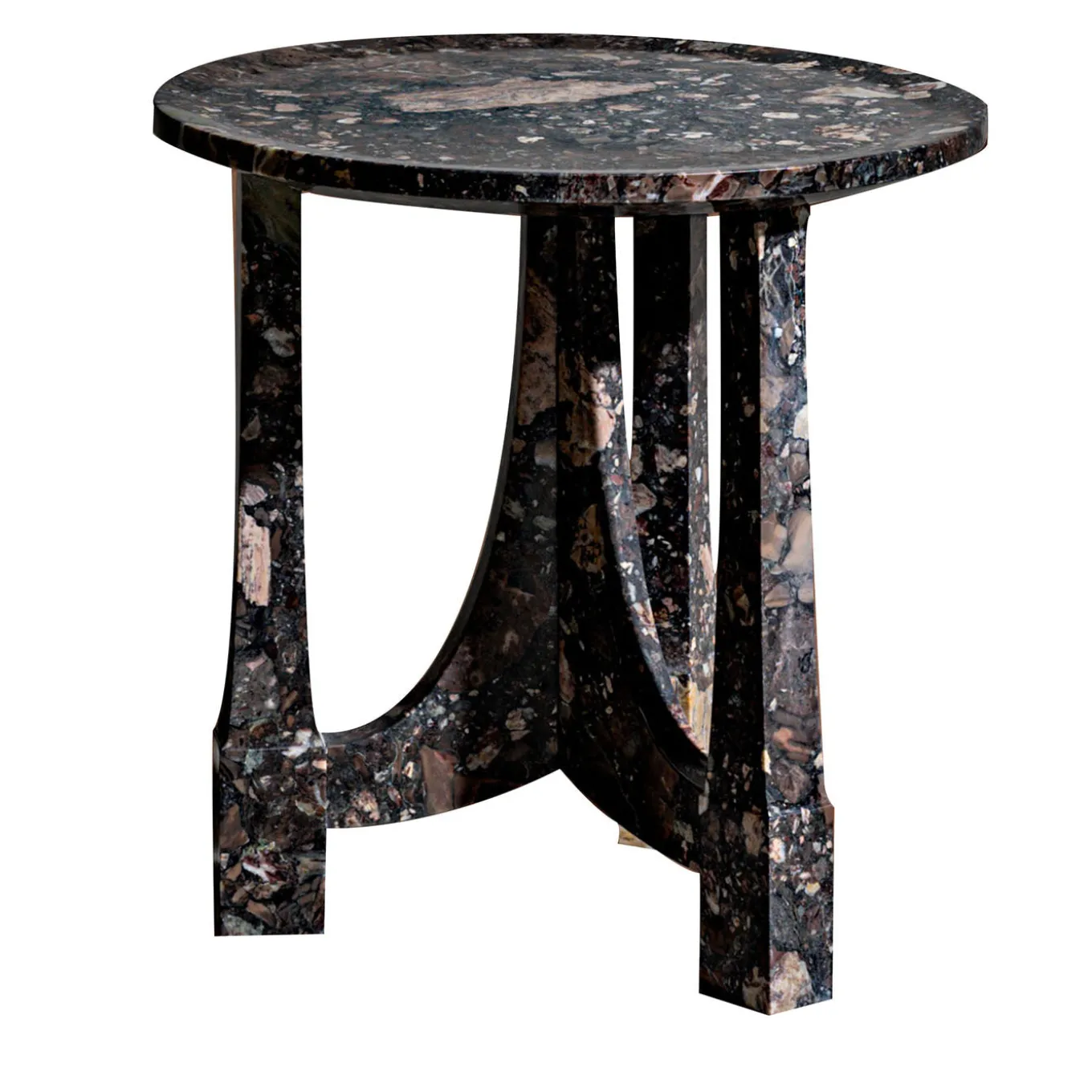 The crown round broccatello marble side table features a base formed by vertical, slender elements connected with softly curved cross-pieces, resting on parallelepiped feet crafted from the same type of marble. Its design evokes an inverted crown shape, highlighted by a circular top of constant thickness. The table is part of a collection available in a selection of natural stones, enabling a customized design by Christophe Pillet.