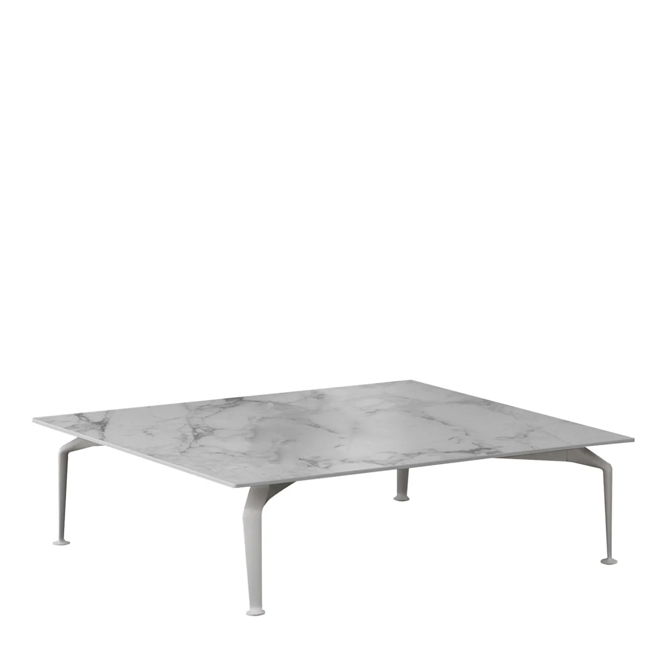 Outlined by a clean and sharp profile that adds singularity and sophistication to the piece, this large and low coffee table is a stunning design by Ludovica and Roberto Palomba. It features a white-lacquered aluminum base with tapered legs supporting a square top in first-rate white Calacatta marble.