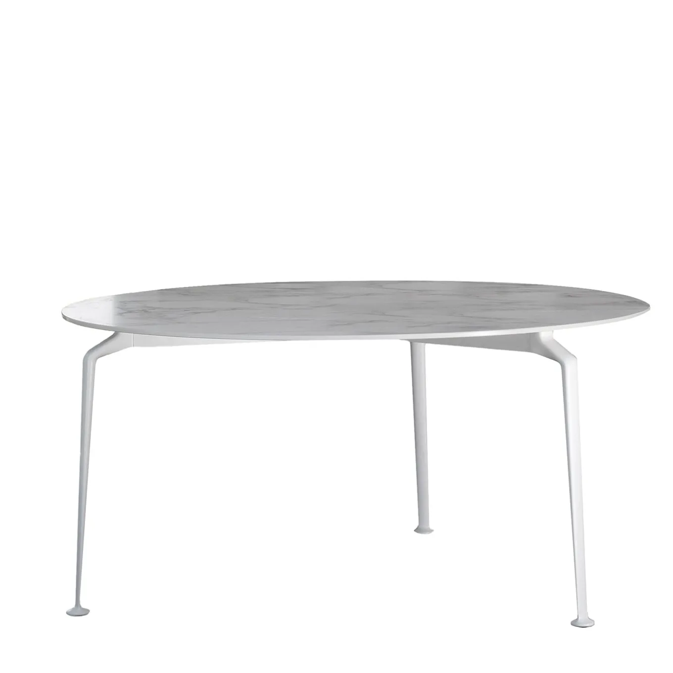 A refined design showcasing a total-white look, this dining table will take center stage in a contemporary decor. Characterized by fine, sleek lines it is designed by Ludovica and Roberto Palomba. It features a white-lacquered aluminum base with three tapered legs supporting a round top in precious Calacatta marble.
