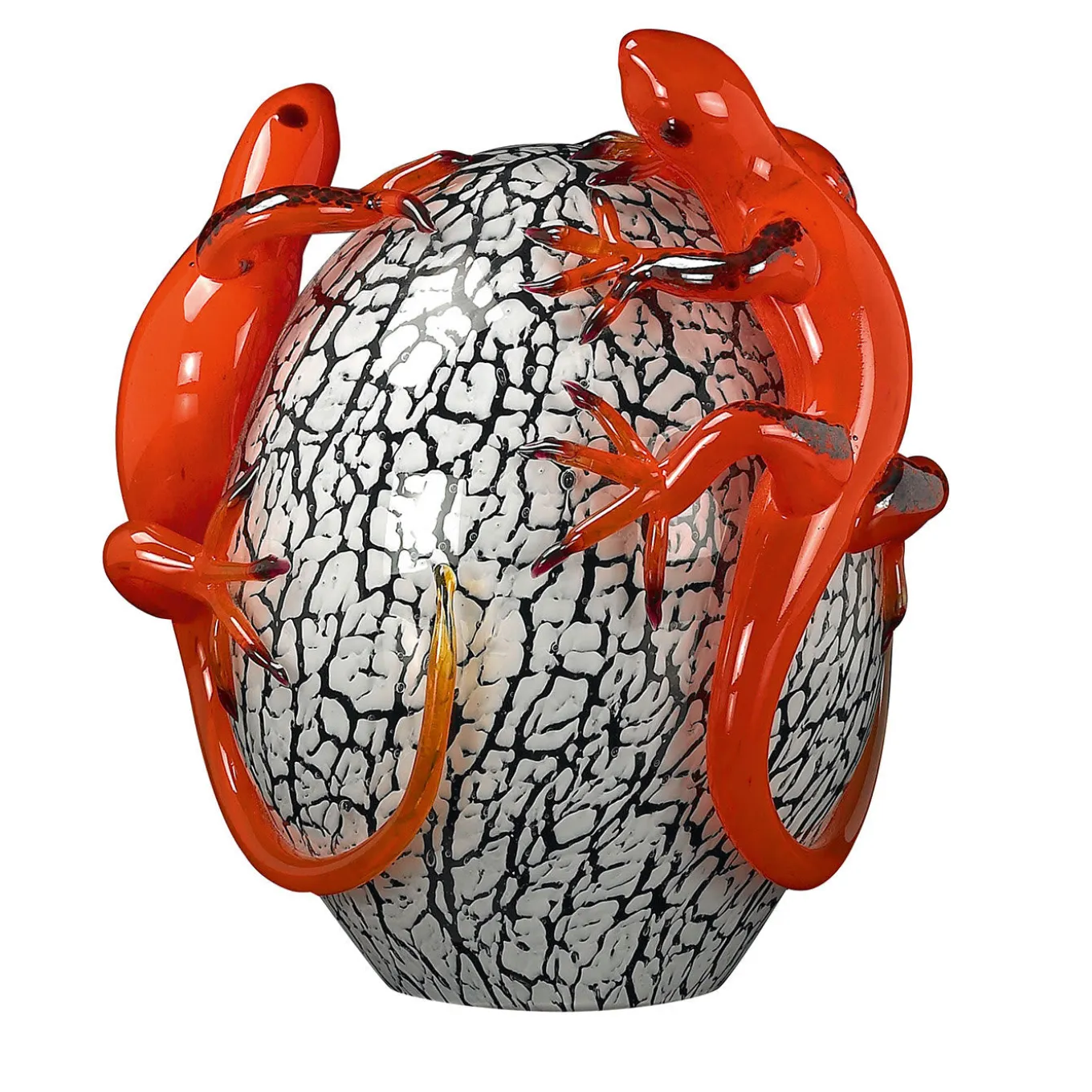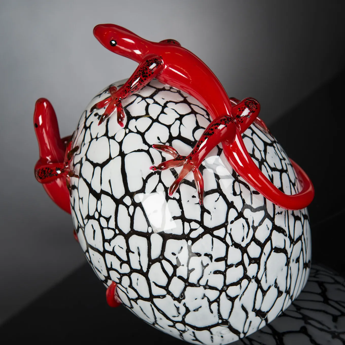 A splendid celebration of nature, this glass statuette will lend a refined quality to a modern console, sideboard, or coffee table. Masterfully crafted by hand, it reproduces the veined silhouette of a cracking egg enriched with two vivid red geckos.