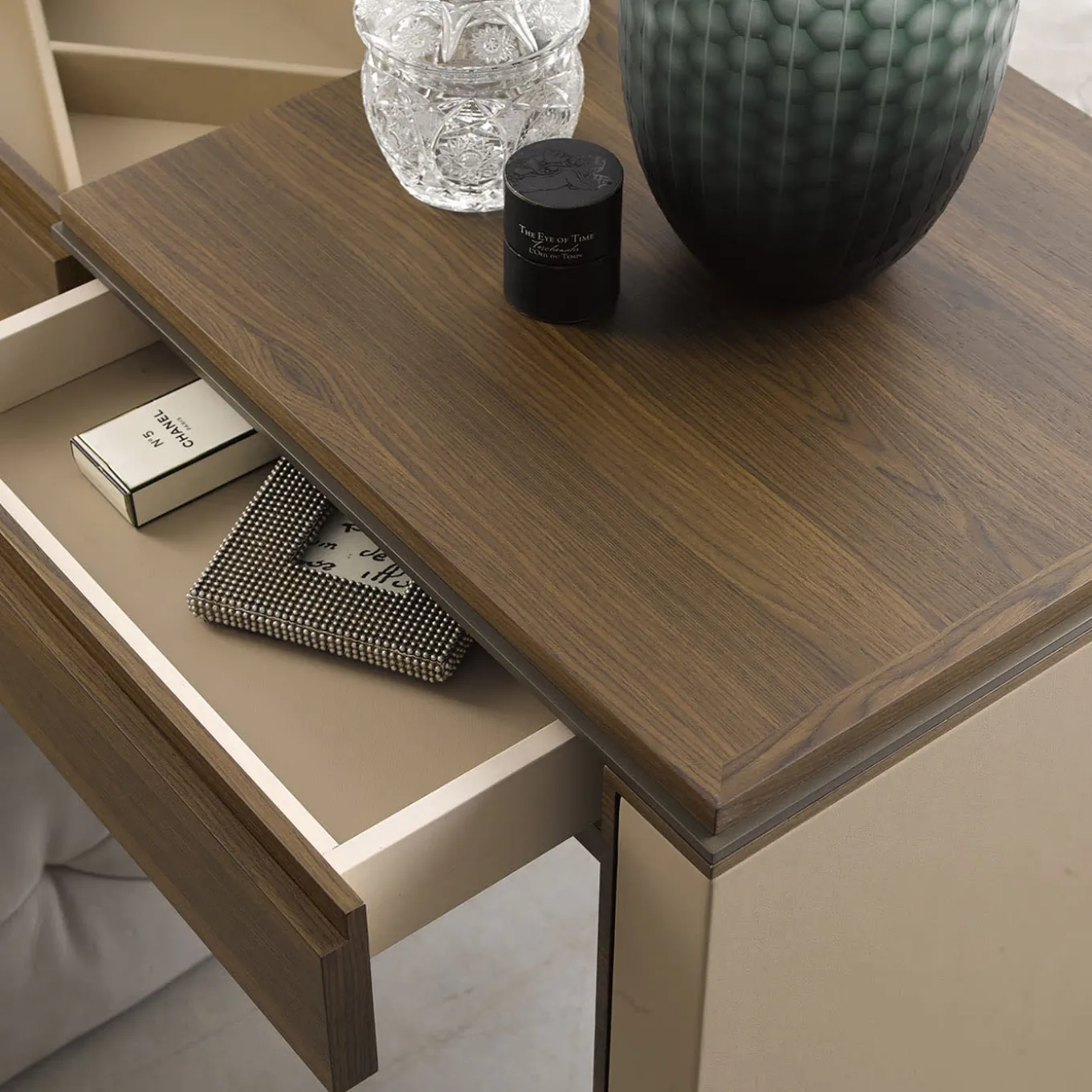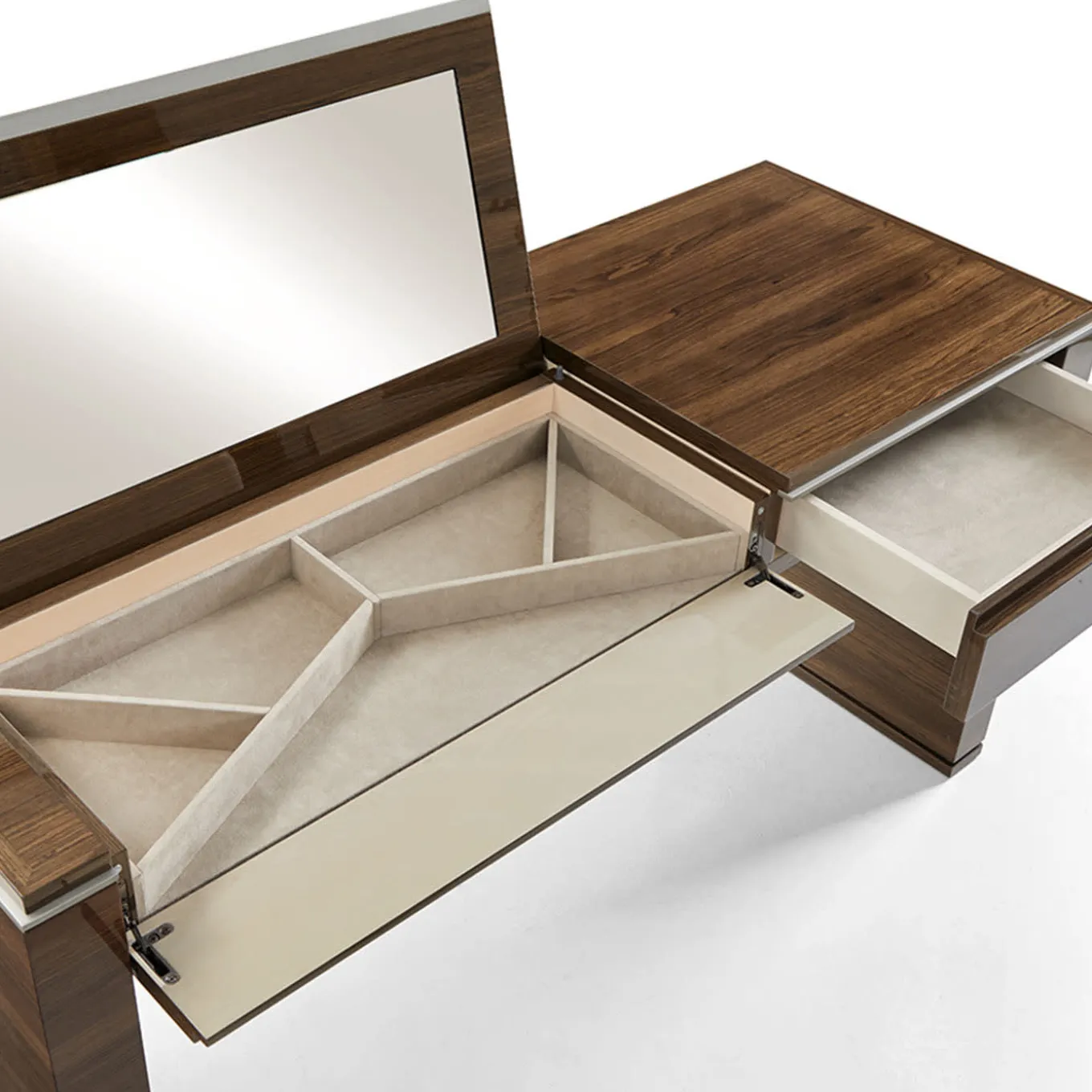 An authentic cabinetmaking gem, this superb vanity desk is a luxurious addition to bedrooms or walk-in closets. Crafted of prized Canaletto walnut and offered in a high-gloss finish, the structure flaunts rigorous volumes accented with steel profiles. A display door—built in the top and activating an LED lighting mechanism once lifted—allows access to the inner compartments. A practical drawer completes the design.