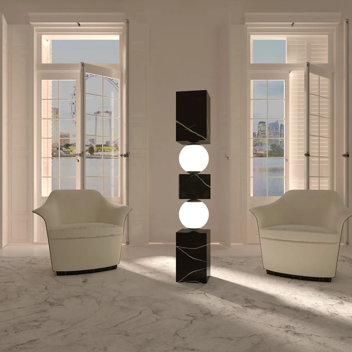 Experience the mesmerizing display of marble blocks delicately intertwined in an illusion of unstable equilibrium. Supported by luminous spheres, this sculpture metamorphoses into an enchanting lamp, surprising observers with its radiant allure.