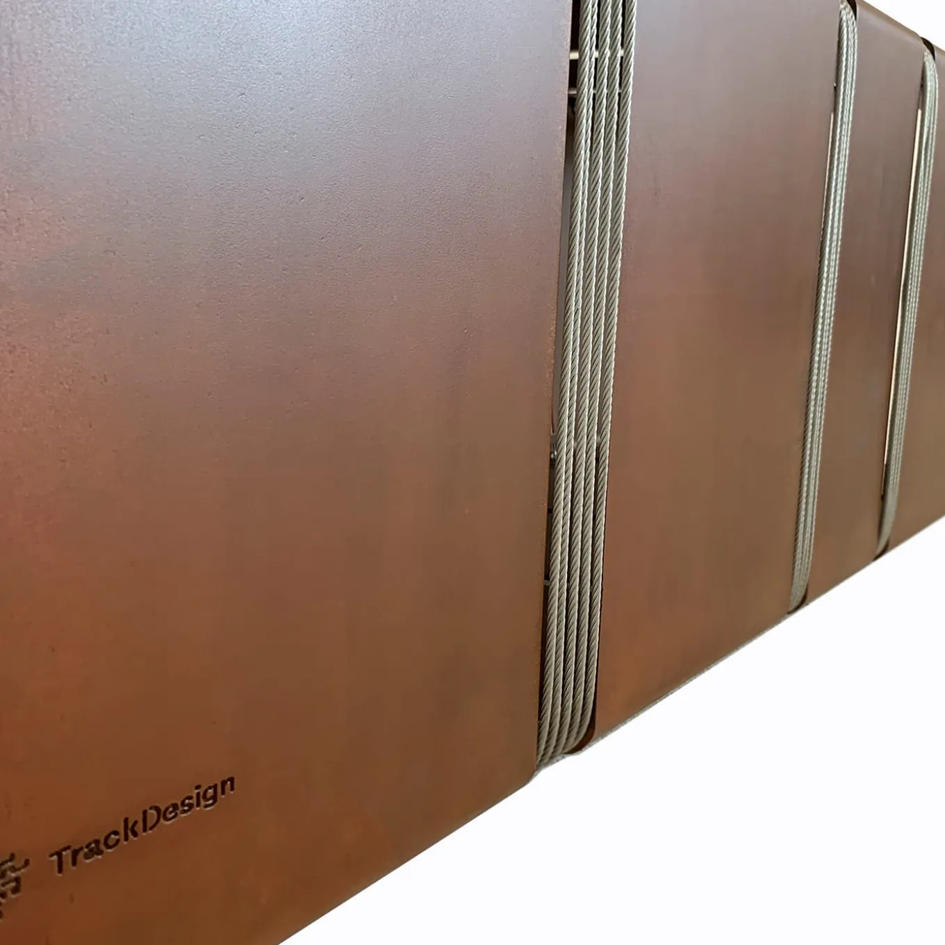 Made from weathering steel, this outdoor bench has an original and captivating design. Parallelepiped metal is formed into five irregularly shaped elements by means of transverse cuts, over which synthetic fiber ropes are wound on circular, stainless-steel bars to firmly hold the elements together. Various finishes on the weathering steel highlight the material’s unique nature.