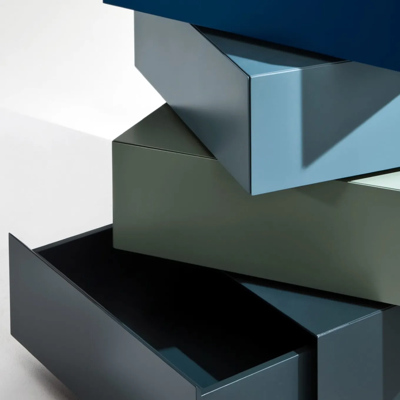 This rotating, sectional dresser with three drawers piled on a common base is a piece designed to impress with its extraordinary sculptural flair. The drawers and base are in matt polyester-lacquered wood, offered in a harmonious palette of blues and grays. Modular drawers compositions with up to seven elements is available upon request. Please contact the Concierge for detailed options.