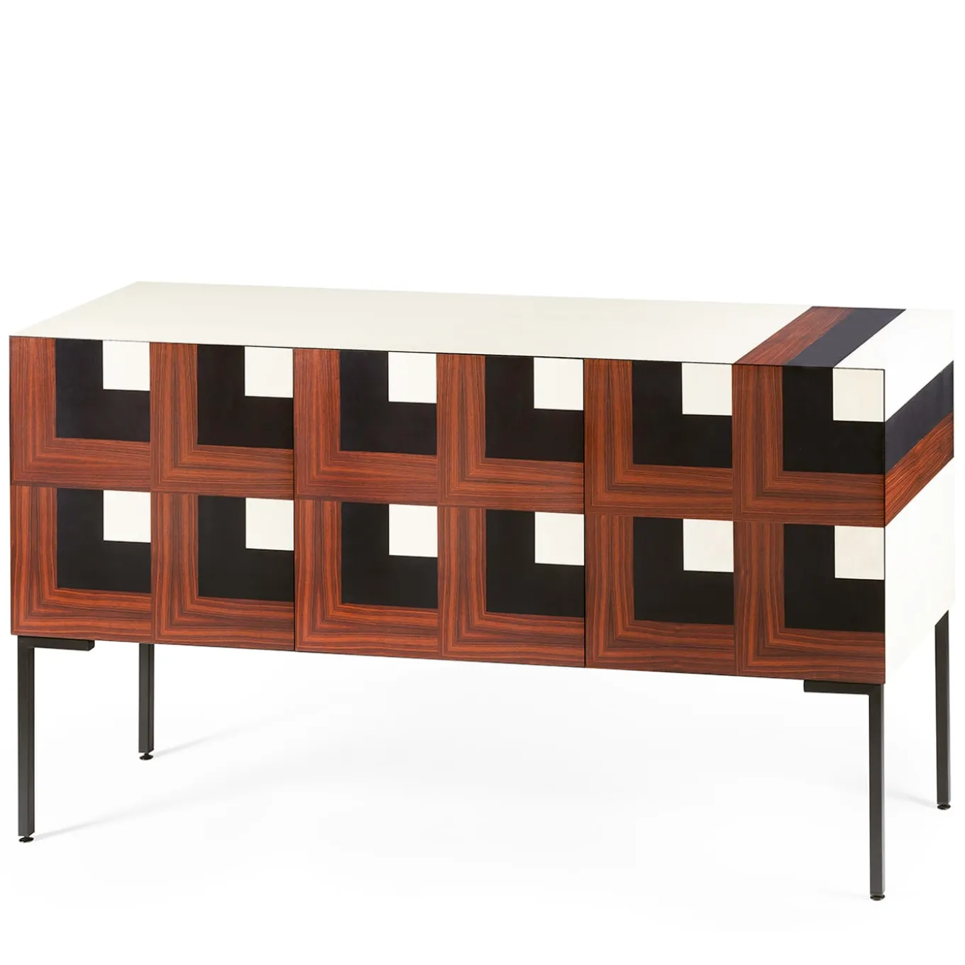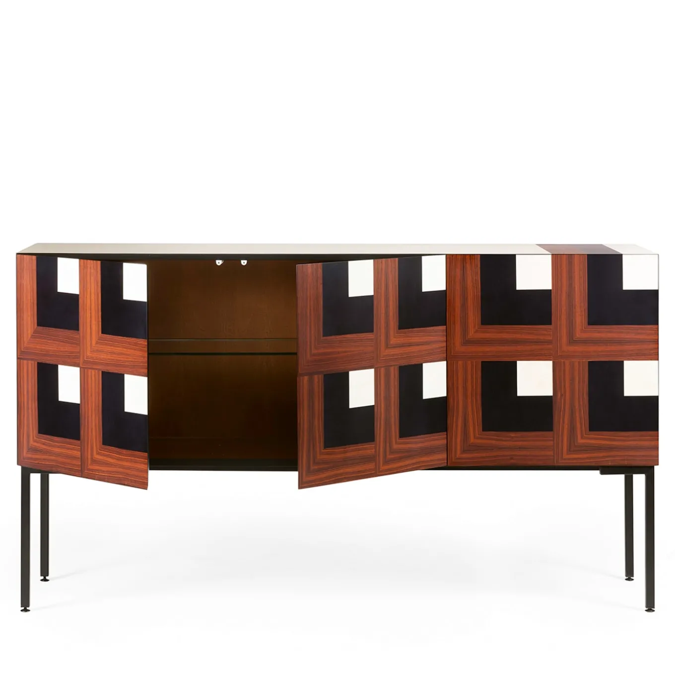 Expert wood masters crafted this piece that features an exquisite wood decoration recreating a three-dimensional optical illusion. The woods used are ebony, violet bois wood, and whitened ash wood while the interior of the piece is in precious Santos rosewood. The elongated brushed iron legs with a black opaque finish complete this striking object that brings timeless glamour to any space.