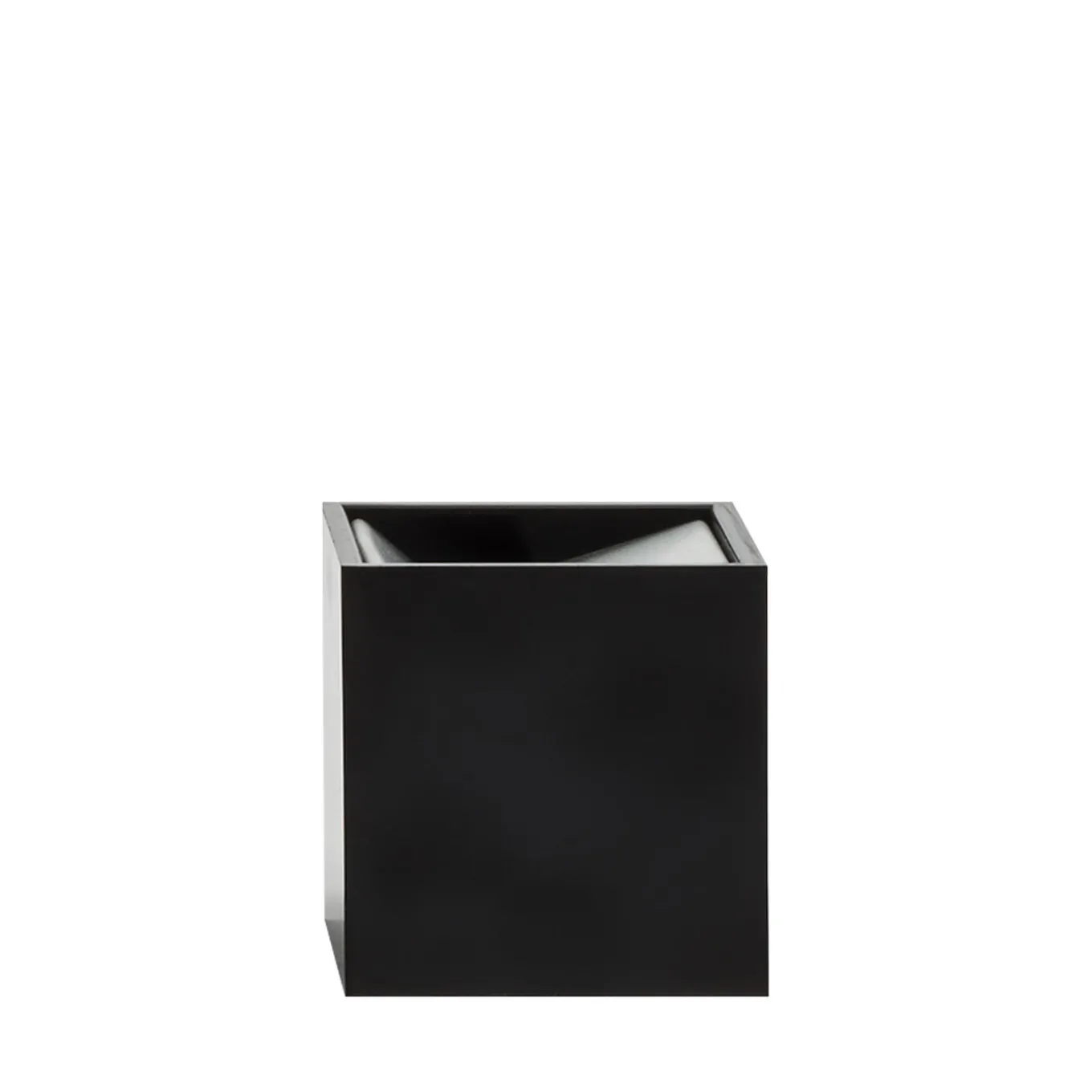 This small variant of the Cubo ashtray by Bruno Munari invites to appreciate functionality in its pure logic, with no need of dwelling on unnecessary ornaments. Set into a cubic body in black melamine open at the top, an aluminum sheet is expressly bent to outline the profile of an acute angle, whose function is to allow easy falling of the ash into the recipient and simultaneously concealing its presence.
