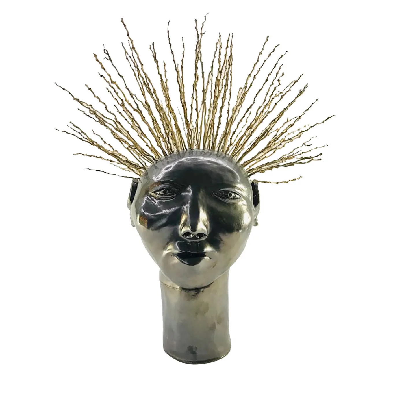 Perfectly exemplifying the brand’s fascination for “freaky” subjects, this superb majolica sculpture depicts a human head with crispy sticks in palm wood simulating a curly hairdo branching out of it. The sculpture is entirely crafted, finished, and finally hollowed out by hand before its first firing in the kiln at 960°C. A satin gray glaze is applied, lending it a luminous yet cool flair, and sealed by the final firing step at 930°C. Please contact the Concierge for customization availability.