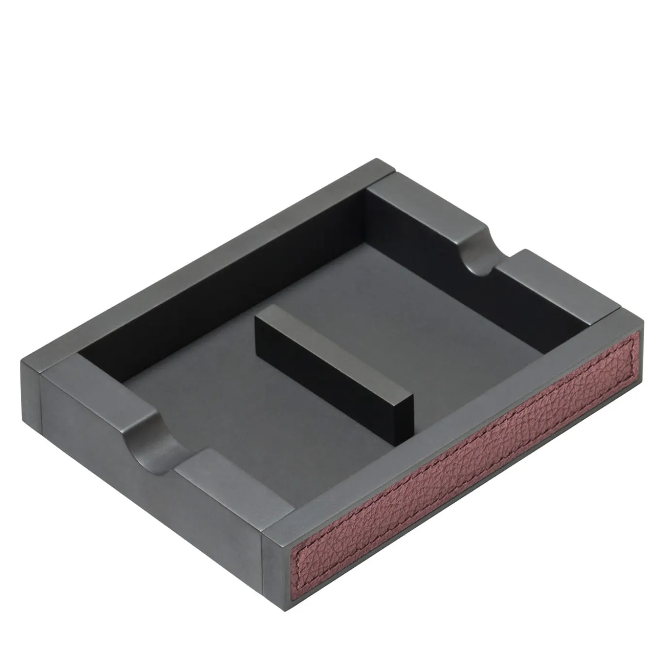 The pieces of this collection boast a sharp, geometric design. They are entirely carved from solid metal blocks available in three different finishes (polished chrome, brushed bronze, and brushed brass) and feature fine leather inserts. It features nappa leather underneath to avoid scratches on surfaces.