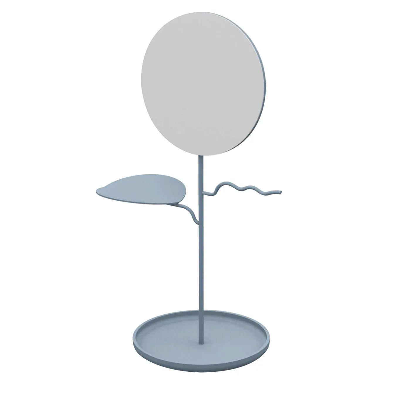 Delicate and evocative in its baby-blue-lacquered iron silhouette inspired by lotus plants, this jewelry stand makes for a clever addition to a bedroom or bathroom decor. The incorporated round mirror is perfect for admiring just-worn accessories, which can be easily arranged and picked from the collection neatly organized thanks to the two frond-like arms protruding from the central stem, which in turn rises from a circular base/tray. Please contact the Concierge for other available colors.