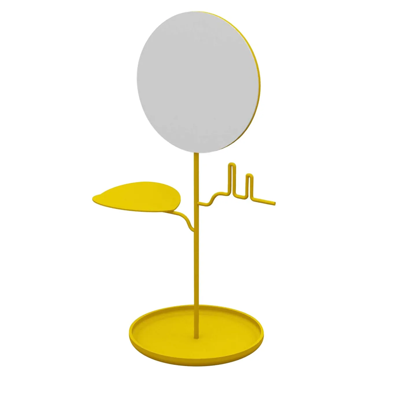 Fully lacquered in bright yellow to infuse a sparkle of optimism into any contemporary home, this jewelry stand with an incorporated mirror strikes with its utmost functionality and superb decorative potential. The dainty iron frame boasts a lotus-inspired design featuring a winding arm and a leaf-like element branching out from the straight central stem that rises from a circular base serving as a tray for bolder accessories. Please check other colors with the Concierge.
