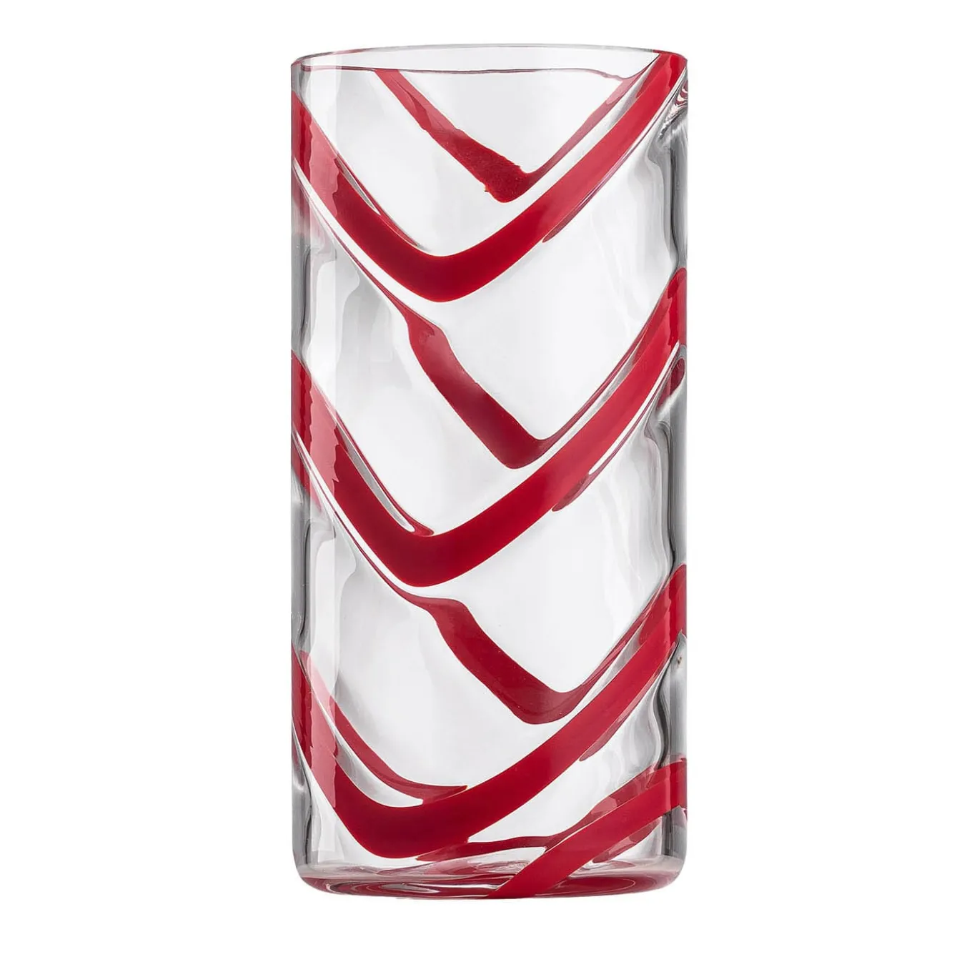 Unmistakably contemporary in its coexistence between ethereal and daring traits, this glass allows for sipping a good drink while pleasantly distracted by its eccentric design. Sinuous waves obtained with red glass threads emerge vibrant against the otherwise crystal-clear Murano glass body. Different color options are available in the Artemest catalog for bubbly mix-and-match arrangements.