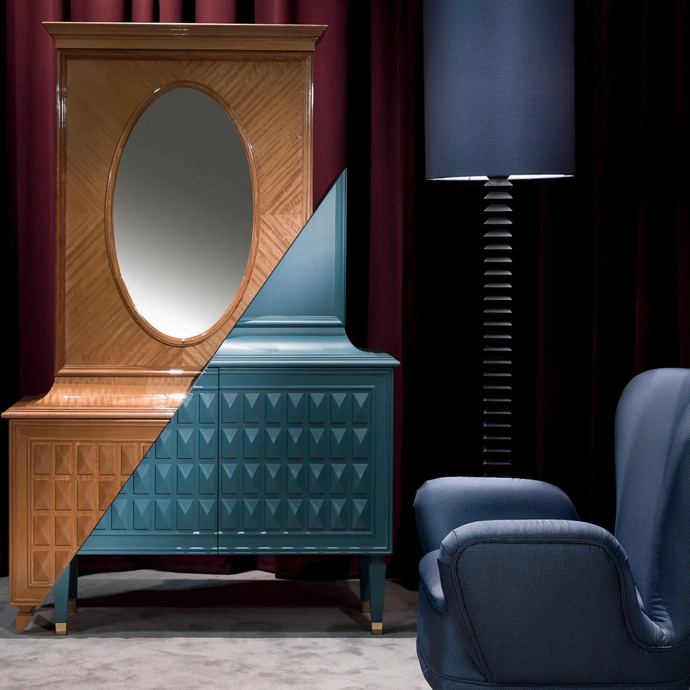 For the collection, D/Vision, Ferruccio Laviani implements a process of decomposition and separation, on different levels. Starting from the trumeau – a fashionable item back in the 1950’s – Laviani redesigns its outline, making it an unexpected, surprising object, while still unveiling its original shape. In D/Vision .1 the unit is literally divided into two parts by an imaginary diagonal line. In this case, the upper part symbolically slides downwards, changing the original design. The bipartition is reproduced by the colours and finishings, contrasting the blue lacquering of the lower part and the crimped walnut of the upper part, where the oval mirror was also kept.