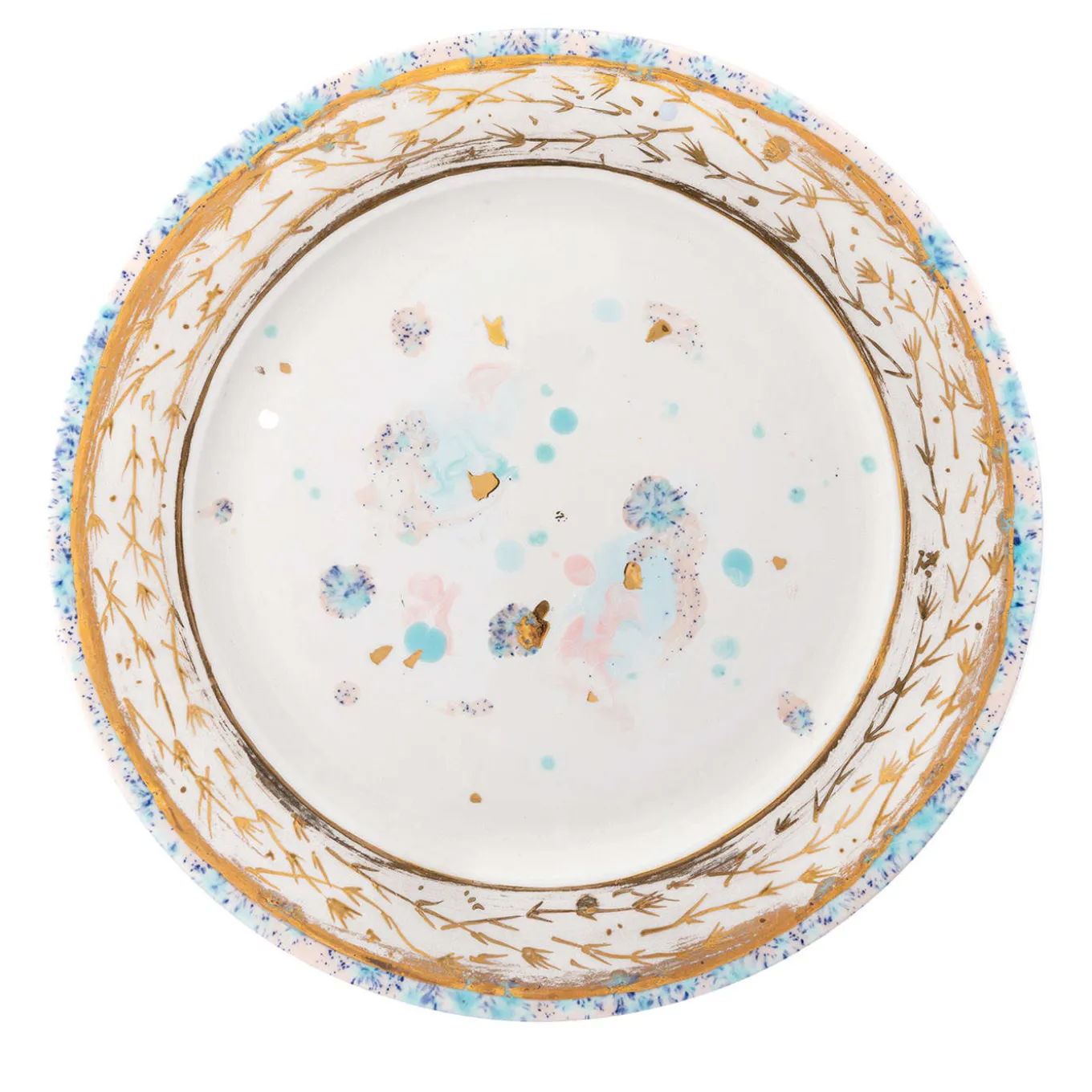 This superb serving plate is part of the Dafne collection, inspired by the opulent elegance of Renaissance and Baroque art and named after one of the six rooms of Galleria Borghese in Rome. This modern interpretation of a classic design combines a stylized garland of roses hand-painted with gold leaf over the white porcelain background. A delicate combination of pale blue and pink adorns the rim of the plate and dots its center for a sophisticated final effect.
