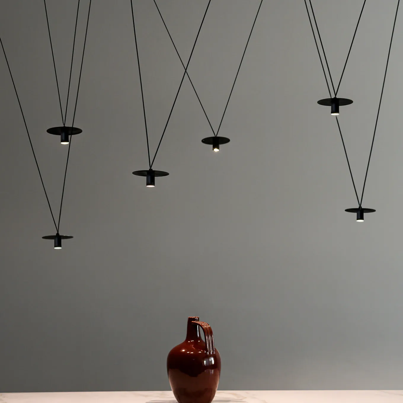 The result of perfect proportions, harmony and balance, this pendant lamp will feel at home in a large contemporary interior, creating a spotlight above a dining room or living room seating ensemble. Composed of six LED 5W housed in small matte black or white aluminum cylinders with a round canopy, they are suspended from a round ceiling rose with a black or white cable, and fastened to the ceiling with hooks in entirely customizable geometric designs. Available in the 4-light variant, punctual light with 45° lens (featured), or diffused light (with acrylic diffuser), please contact the Concierge for details.