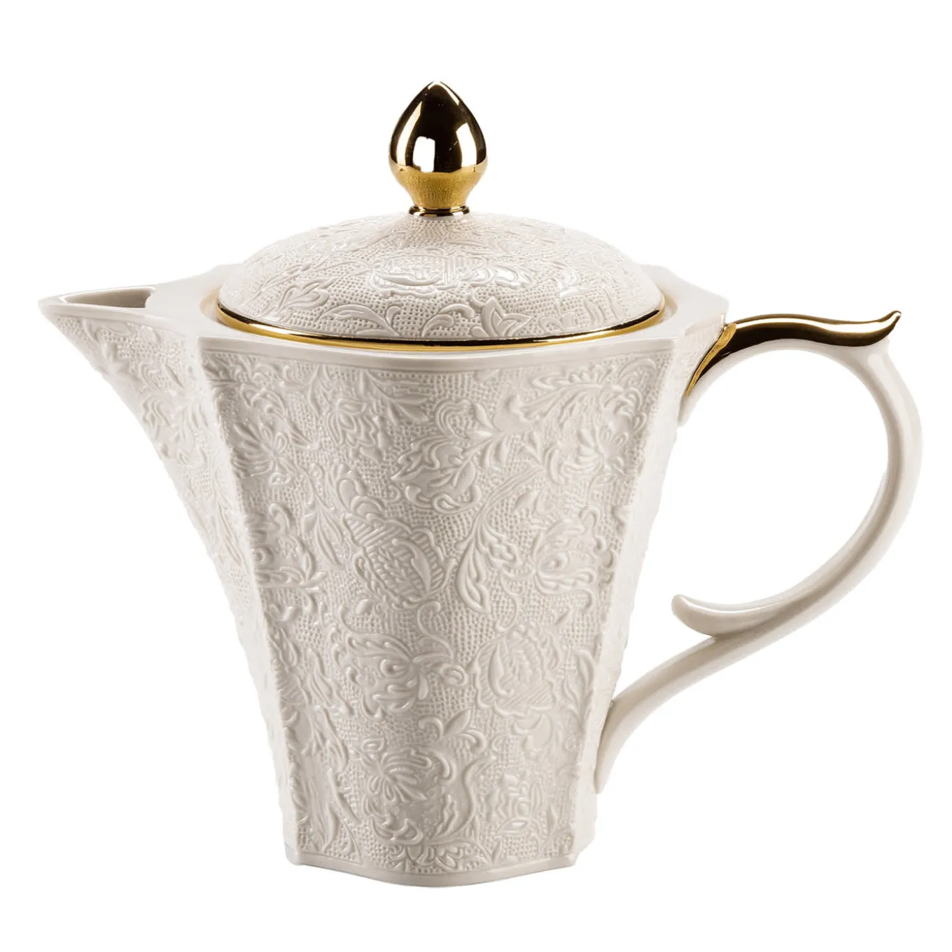Extensively decorated with a minute damask pattern evocative of enchanting Eastern tales, this fine porcelain teapot is an elegant piece demanding attention. A graceful handle completes the flared silhouette with an incorporated spout while gleaming gold accents also illuminate the lid’s hedge and pointed finial. Please explore the entire collection in the Artemest catalog.
