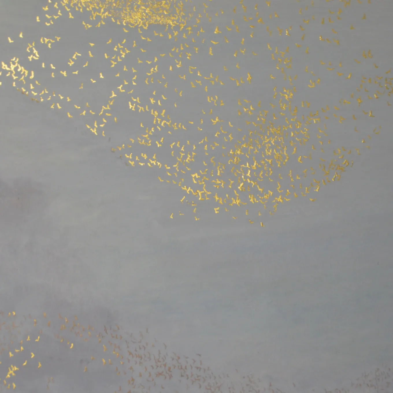 Flying in a dense cluster as if in an elegant dance, the fluttering birds defining this painting are individually crafted in gold leaf and evoke a sense of endless wonder and emergence. The delightful interplay of light and reflections, as well as the untarnished and seductive gold leaf, elevates the piece, evoking eternity and ease.
