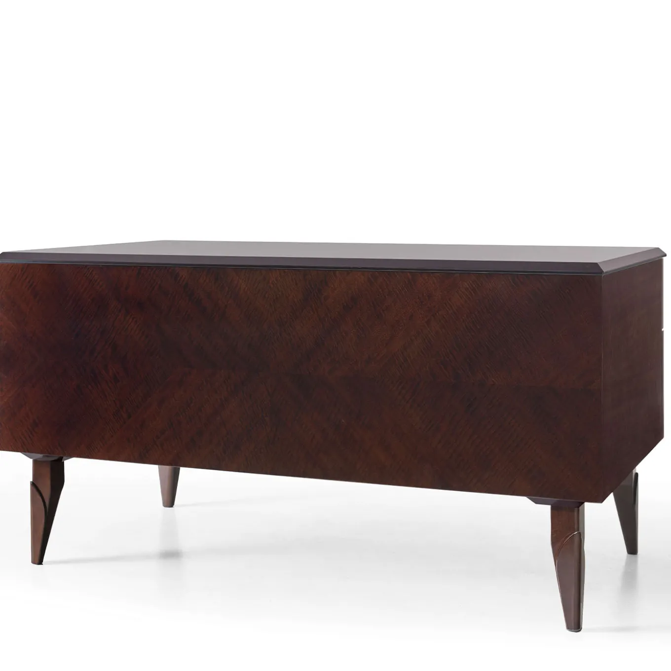 This writing desk combines a warm dark eucalyptus finish with a spacious writing surface and five full-extension drawers for efficient organization. Satin brass handles enhance its refined silhouette, while tapered legs add a touch of elegance. Designed to blend comfort and professionalism, this medium-sized desk suits a sophisticated home office environment.