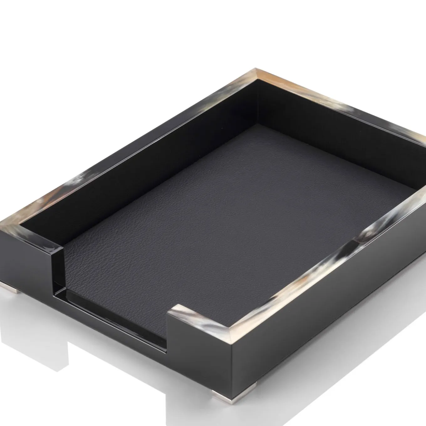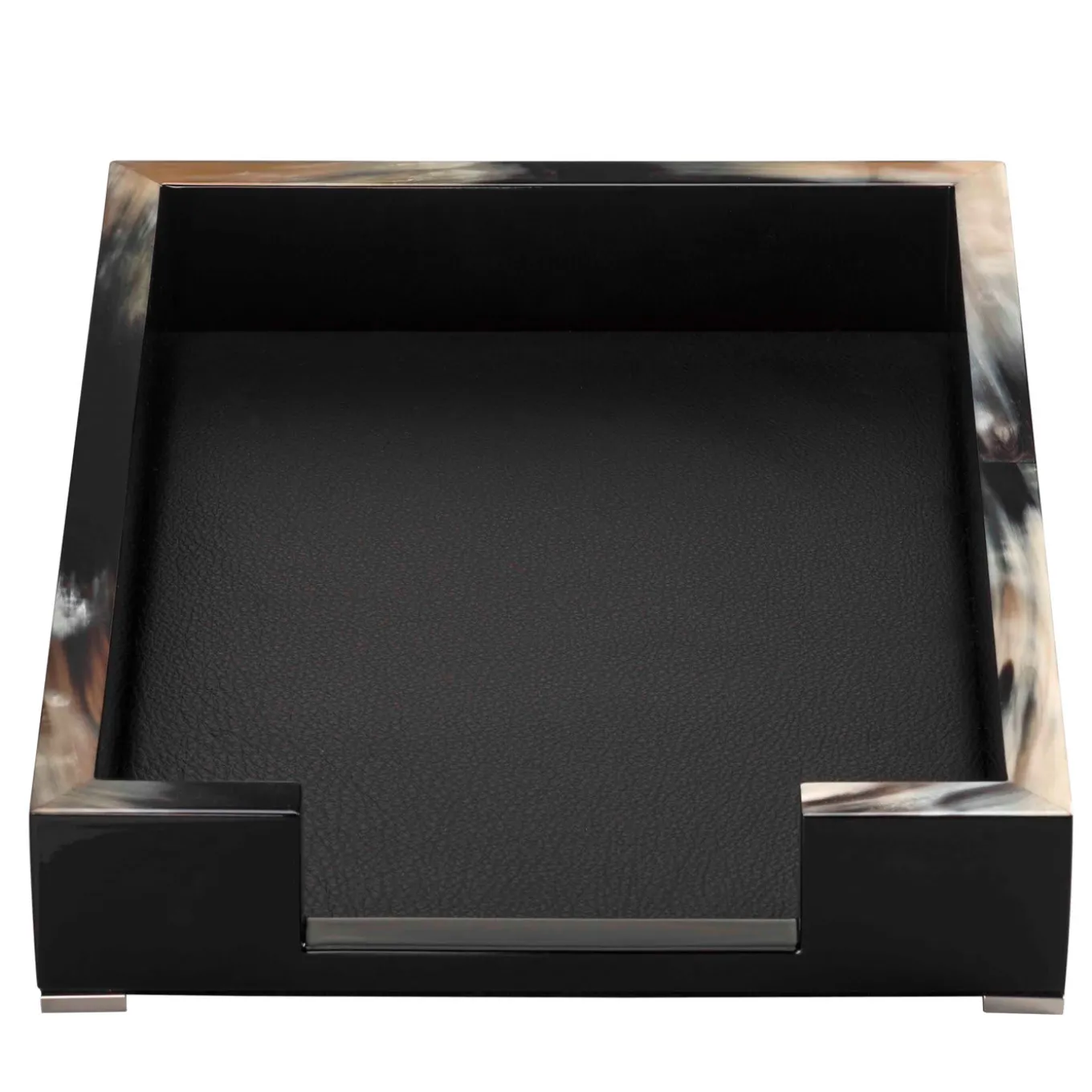 An intriguing combination of exquisite materials makes this letter tray a one-of-a-kind piece of functional decor, suitable for sheets and letters up to 21 x 29,7 cm. Featuring a precious internal lining in black Tosca leather, this refined object showcases a structure in horn and wood, complemented by a lacquered black finish and enriched by four lavish feet in chromed brass.