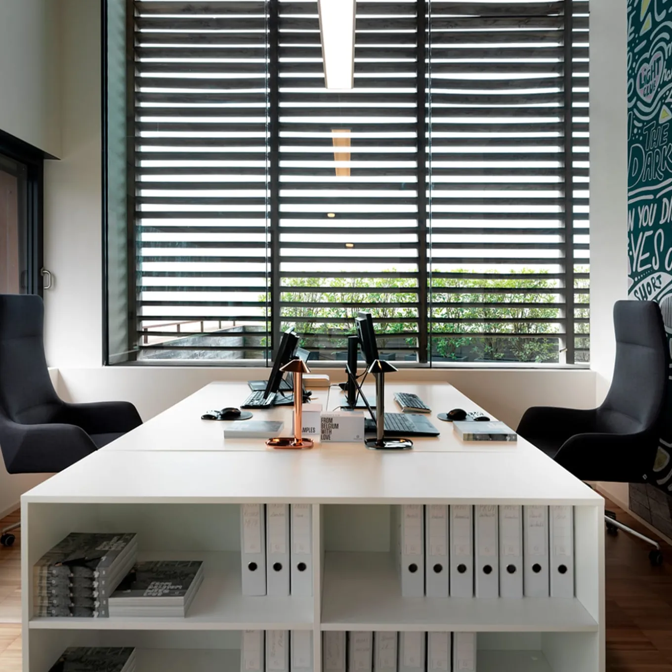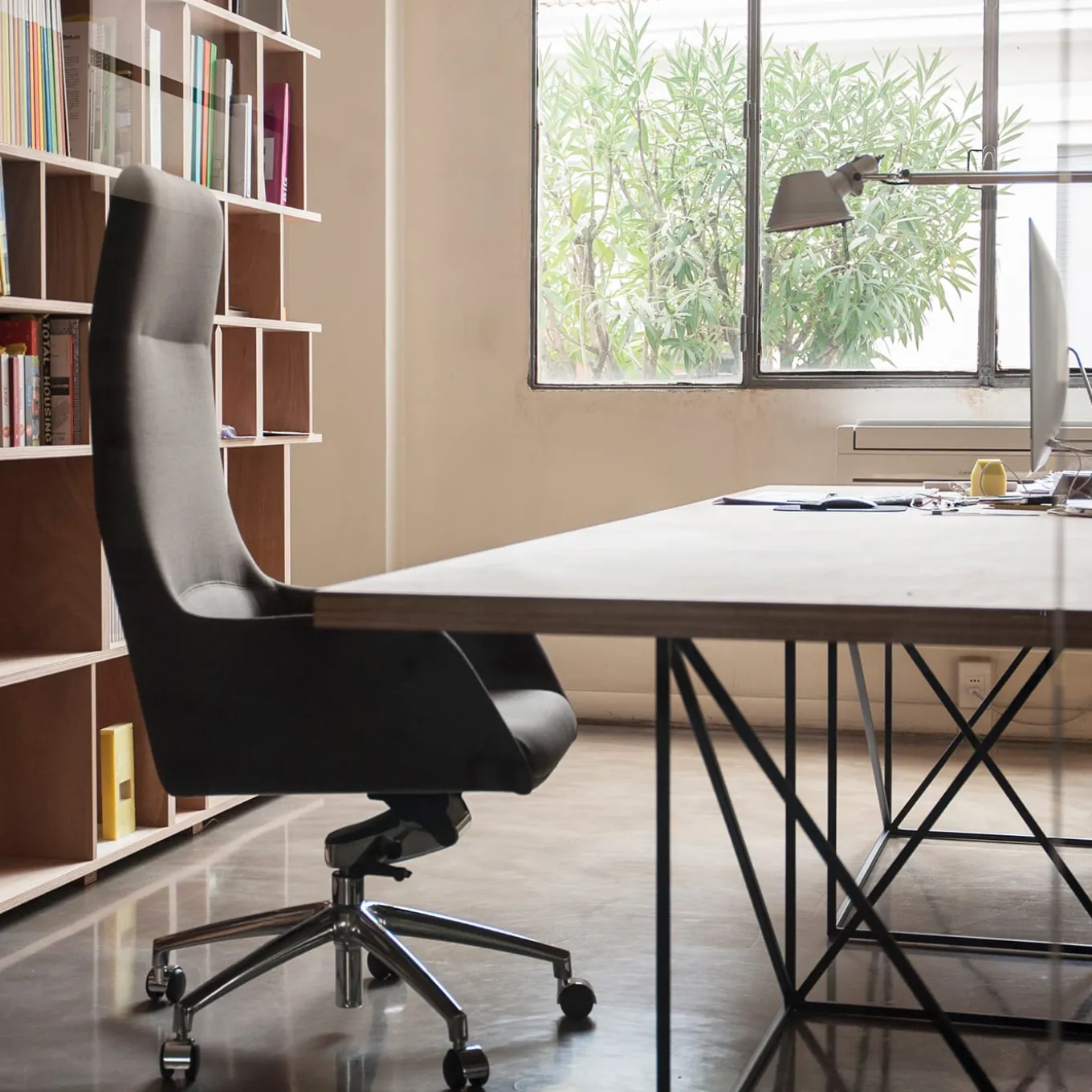 This elegant upholstered executive armchair is characterized by a high backrest and a 5-star base, that can swivel and move up and down.