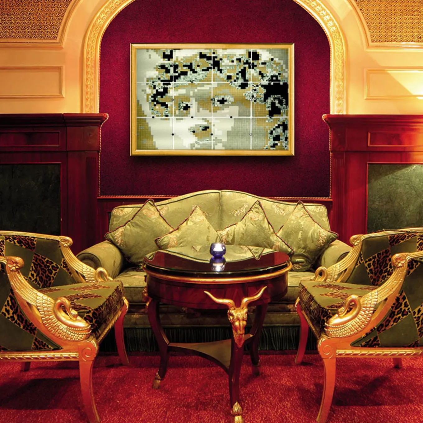 A painstaking process of manual assembly is behind this superb decorative panel depicting the face of Michelangelo’s David. Fashioned of prized Murano glass, each tile gets minutely applied as part of a larger mosaic project here echoing refined Reinassance imagery. Please consult the Concierge for available customization options and pricing.