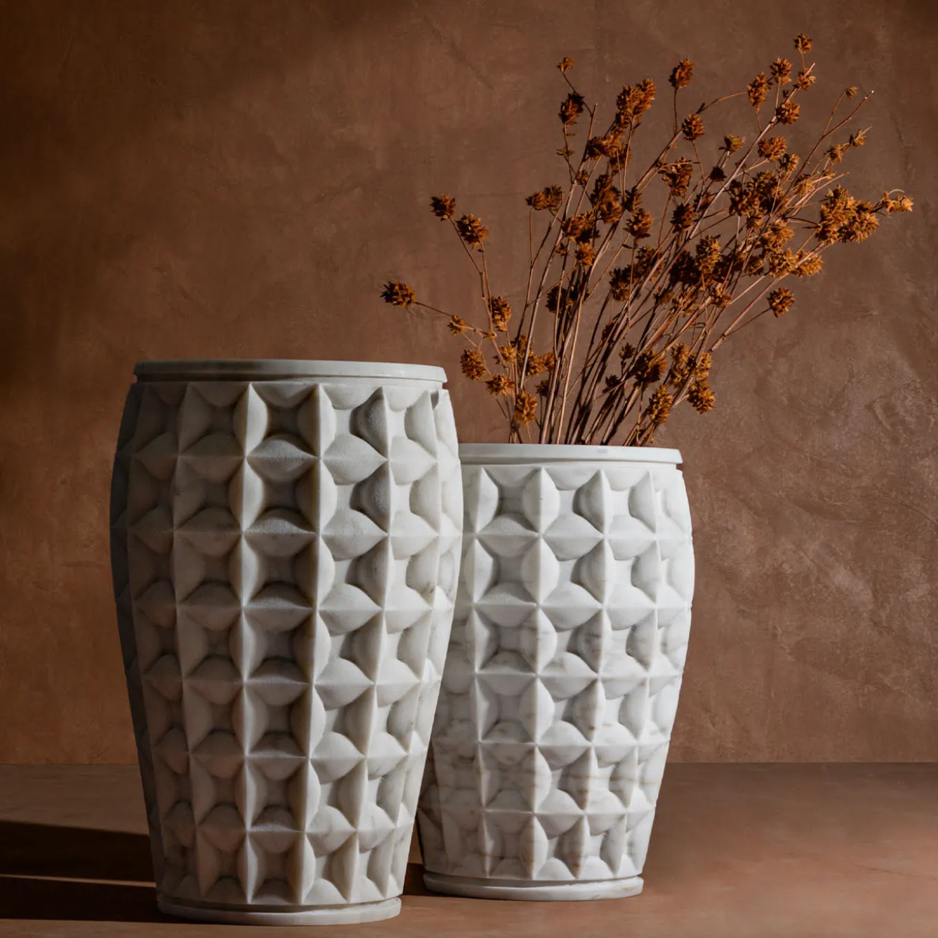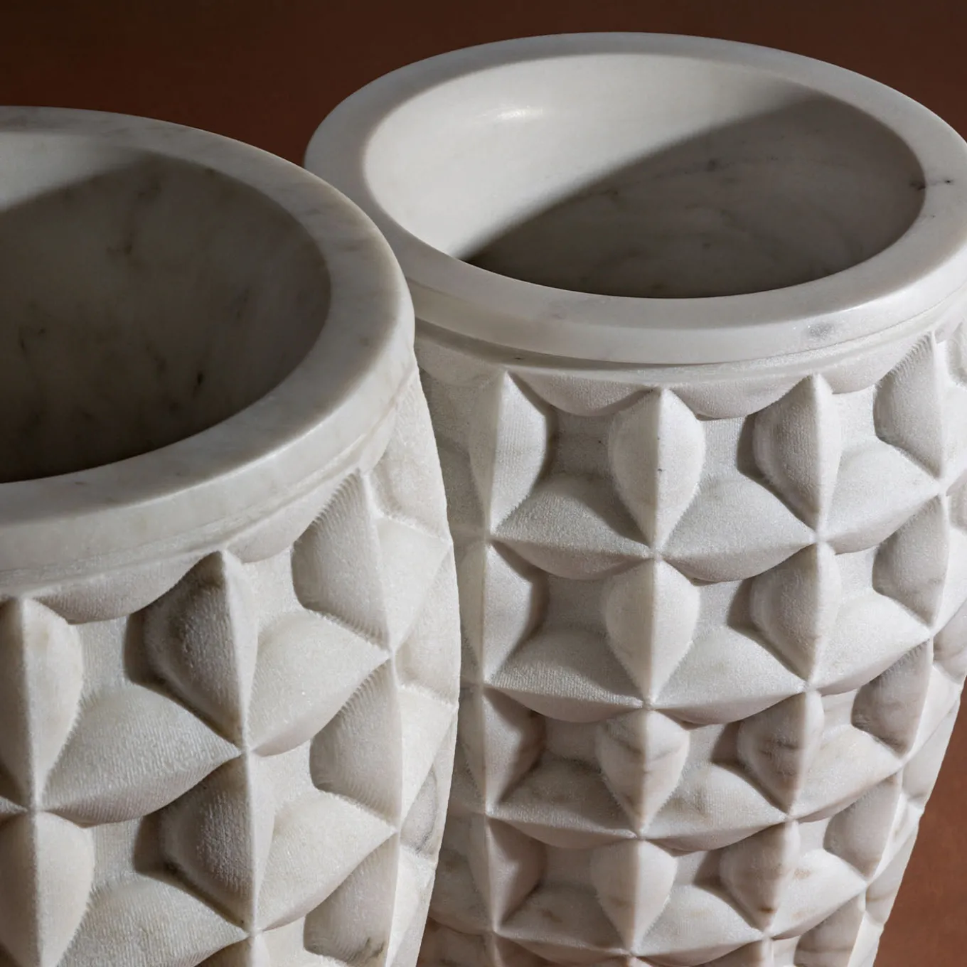 The Dawn large vase holder by Christophe Pillet features a monolithic form with tapered profiles enhanced by a unique three-dimensional grid texture. This intricate pattern is carved and chiseled to highlight the depth and craftsmanship of the marble block. Two polished bands framing the base and top add refined contrast. Designed for versatility, this piece suits both indoor and outdoor settings while embodying sculptural elegance. Dawn Vase is also available in a smaller version, contact the Concierge for further information.