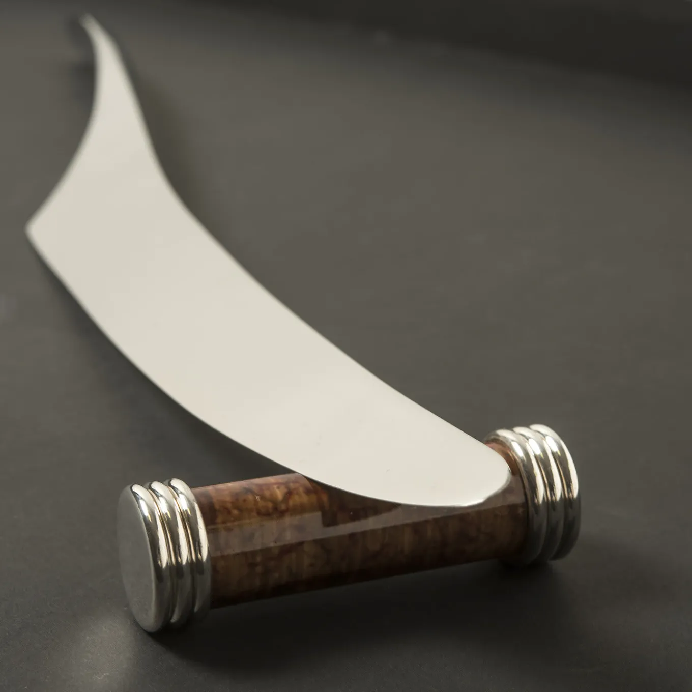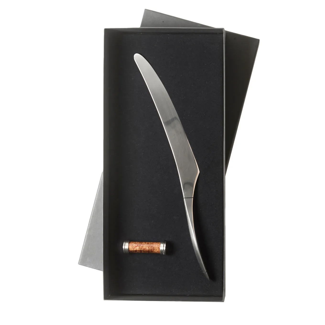 Minimal shapes that deliver pure luxury: this is the mantra of the Decor Tavola Collection by Nino Basso, which includes this roast carving knife and rest set. Forged of stainless steel, the 39 cm-long blade has a mirror polish while the handle has a subtle satin finish. The cylindrical rest (Ø 2xI7cm) in burnt-lacquered metal features the signature grooved rings on each end. Care instructions included in the black custom box.