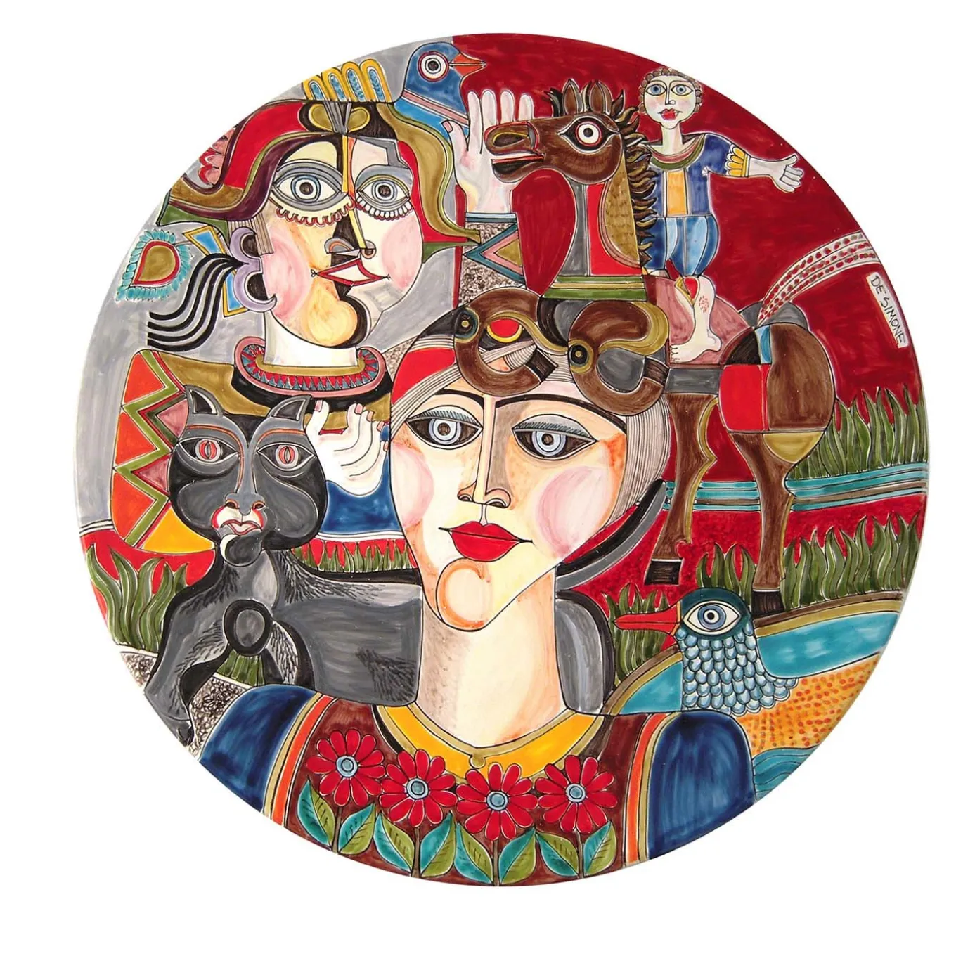 This unique hand-made and hand-painted ceramic plate belongs to the DS collection of the Ceramiche de Simone brand. Today the company’s goal is to provide continuity to the historic brand while keeping focus on creativity. Featuring a woman with a cat painted in Picassian style, this piece can also be hung on a wall as a decorative painting.