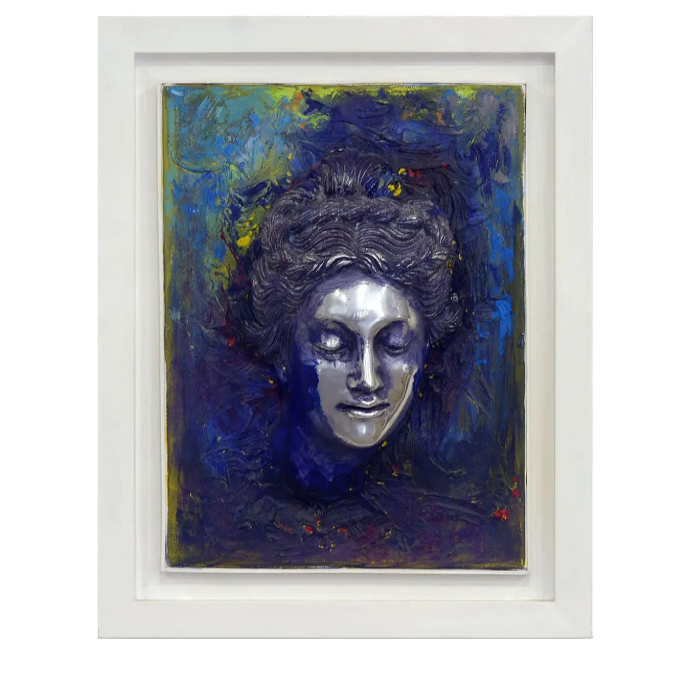 “Deep Resonance” emanates profound introspection and artistic innovation. A meticulously sculpted aluminum face emerges gracefully from the canvas, symbolizing transcendence from chaos to clarity. Encased in a refined lacquered wooden frame, vibrant hues of azure, sunlit yellow, and fiery crimson create a mesmerizing aura. This fusion of sculpture and painting challenges conventions, setting a new standard in contemporary artistry. The artwork is delivered with a certificate of authenticity.