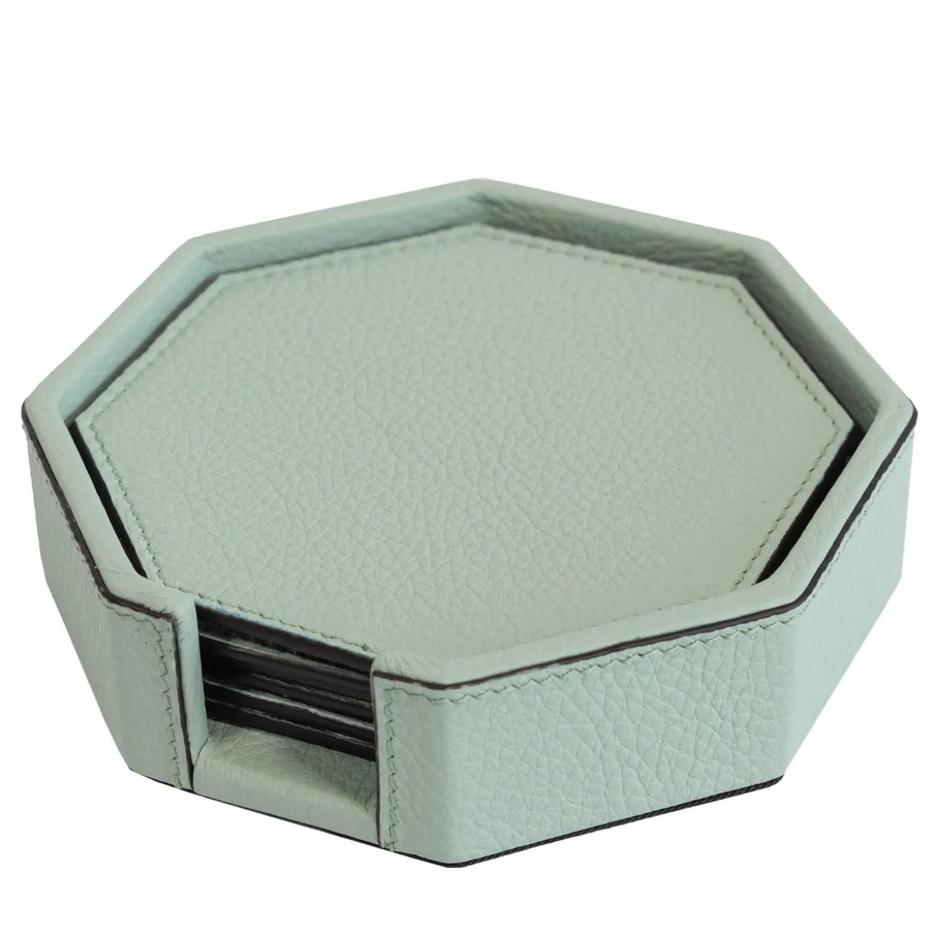 The set of six coasters comes in a handcrafted wooden box, elegantly dressed with fine, soft genuine grain leather. Available in the vibrant smeralda green shade, as well as fourteen other colors, this set offers a stylish and functional addition to any table setting. Please contact the Concierge for more information.