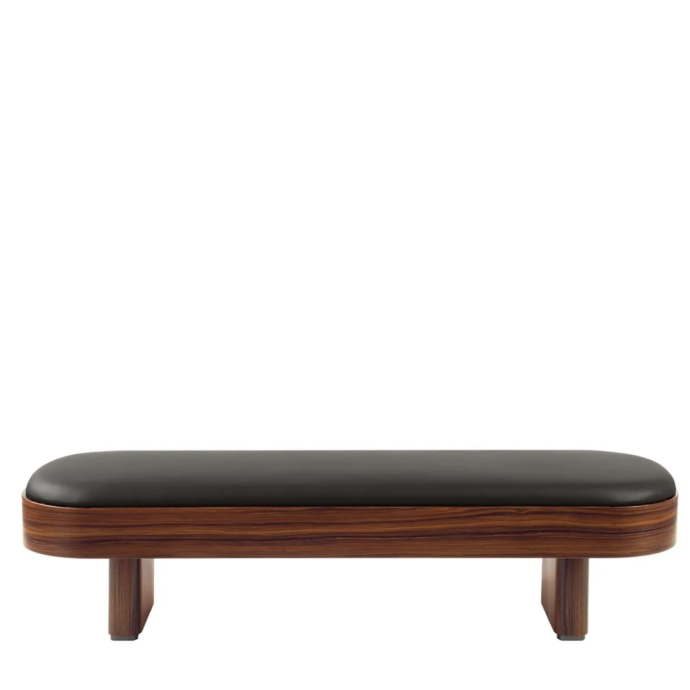 Brimming with minimalist allure, this bench will shine in a mid-century modern or industrial chic decor. The sleek frame is impeccably crafted from MDF with Palissandro Santos veneer and a padded black leather top, revealing a captivating contrast between the wood grain and marble veins. Entirely customizable to taste or decor needs, please contact the Concierge for further information.