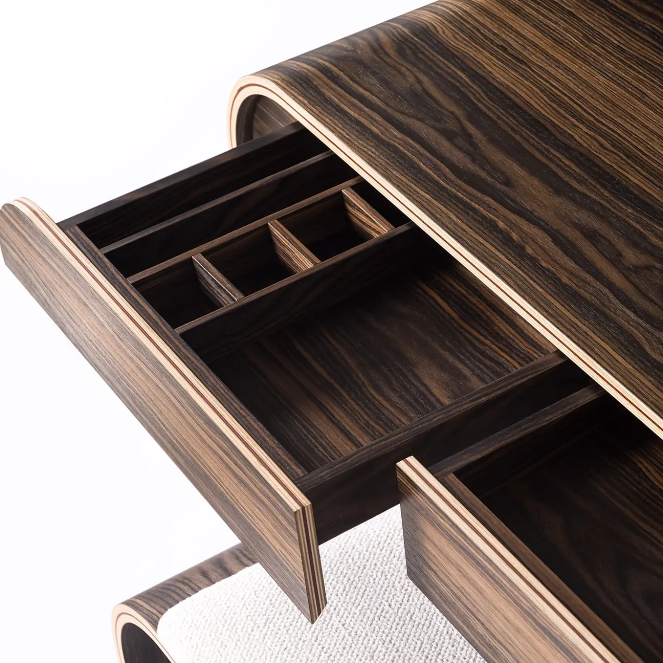 Distinguished by its captivating wood grain patterns, Derj Console and Desk transforms any living space into a professional and elegant workspace. Crafted from high-quality steel with a unique laser-cut pattern of three dots, and veneer wood. The desk features built-in sockets and USB ports for convenient charging, and two discreet top-backside drawers offer ample storage. Hidden wheels on the back legs ensure easy mobility.