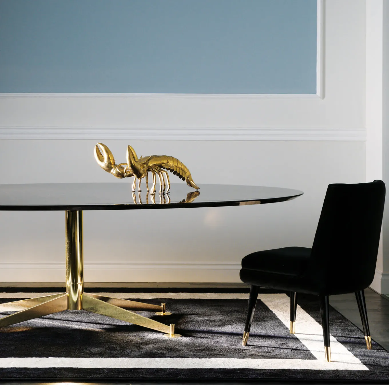 Sophisticated and inspired by the timeless grace of mid-century decor, this dining chair can also be displayed as an accent piece in an entryway or used behind a desk in the study. Its elegant and feminine silhouette is made of wood with black glossy lacquer on the slanted, tapered legs, adorned with glossy brass-plated metal tips. The L-shaped top with padded back and extra cushion on the seat creates a balanced design that invites to relax. Contract and commercial certifications available upon request.