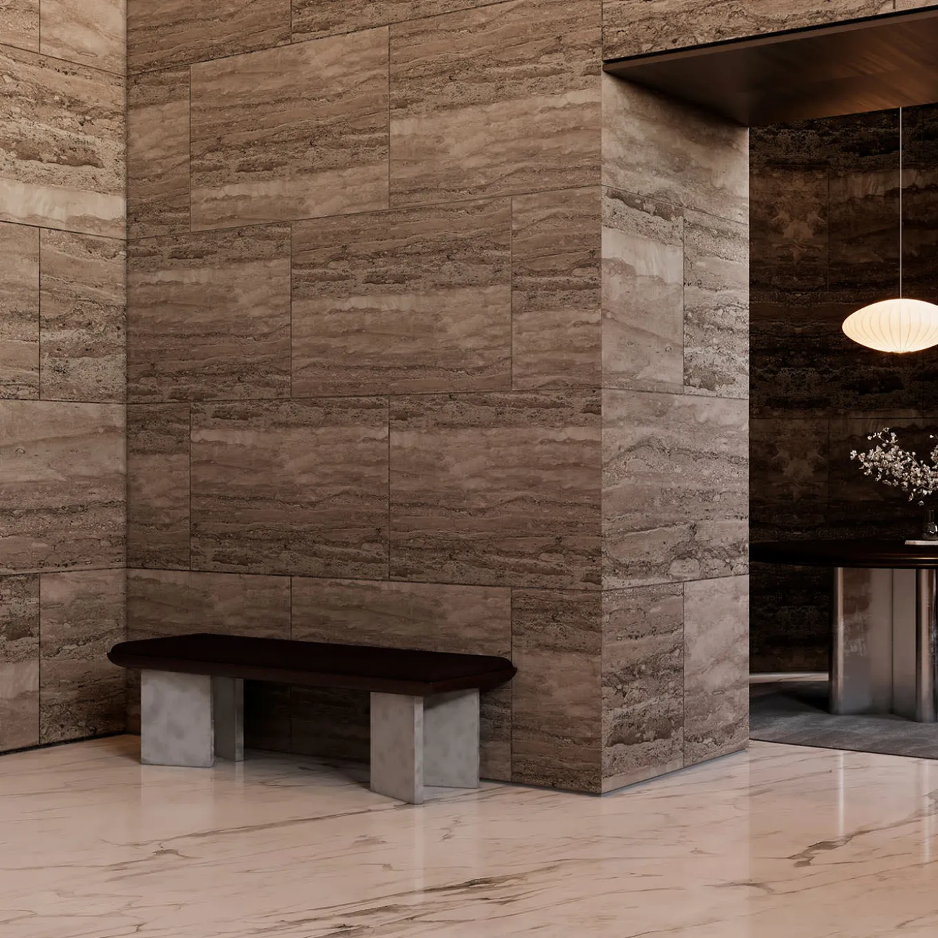 A modern homage to ancient Greek imagery, Diphrosi draws from Milanese mid-century proportions and palettes, juxtaposing indulgent materials with versatile functionality, redefining the bench’s role within a space. Rectangular scalloped edge three-seater Birdseye bench, with velvet suede leather upholstery and diagonal hand brushed tarnished steel legs.
