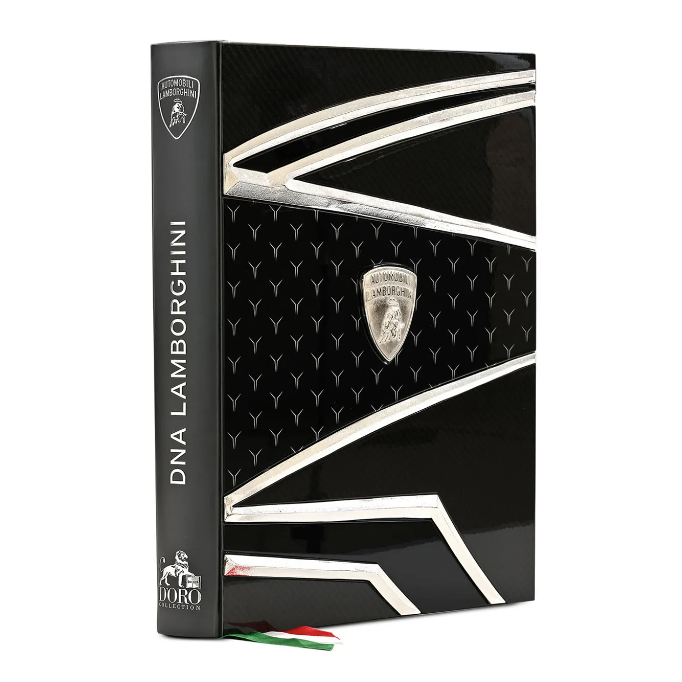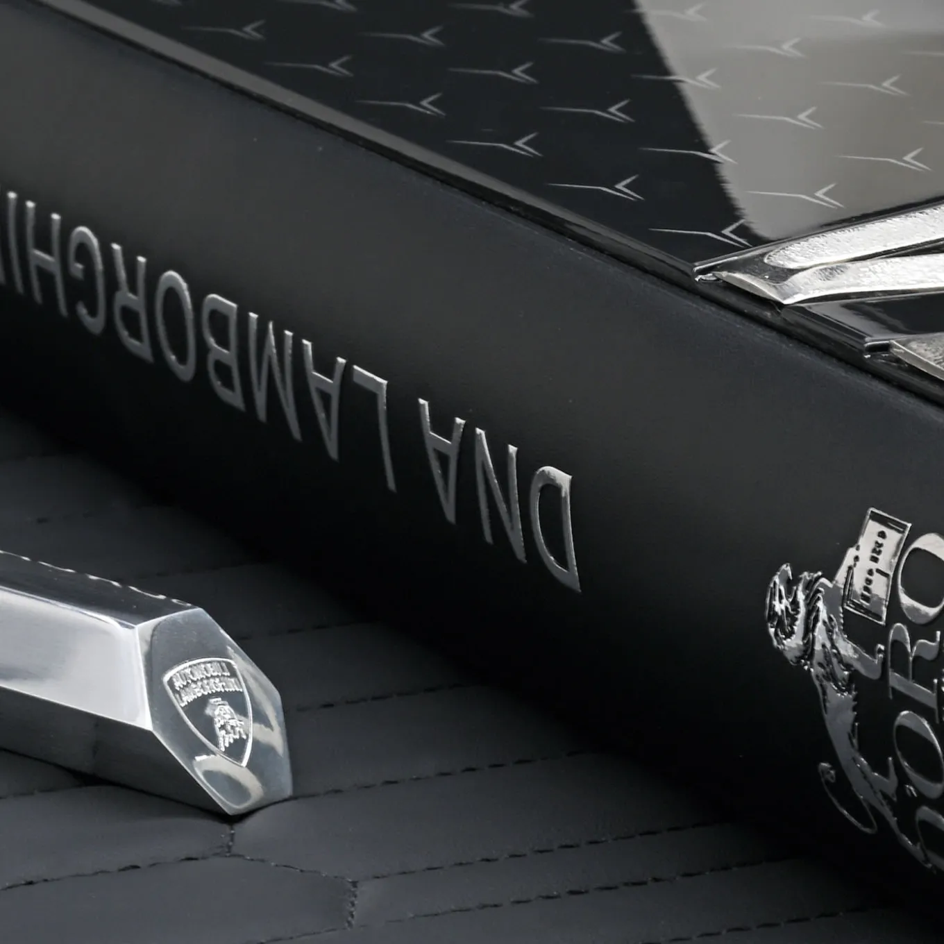 Discover DNA Lamborghini Platinum Edition, a tribute to Lamborghini’s heritage. Edited by Antonio Ghini and illustrated by Mitja Borkert, it features more than 380 pages of photographs, technical specifications and anecdotes. The cover is made of hand-painted carbon fiber with platinum-gilt bronze sculptures. The set includes a hexagonal Book Jewel, an aluminum bookmark, a leather pad and a swivel display, all in a logoed wooden box. Each piece is numbered. Limited edition of 60 pieces.