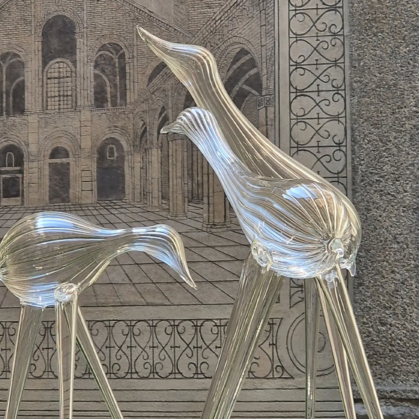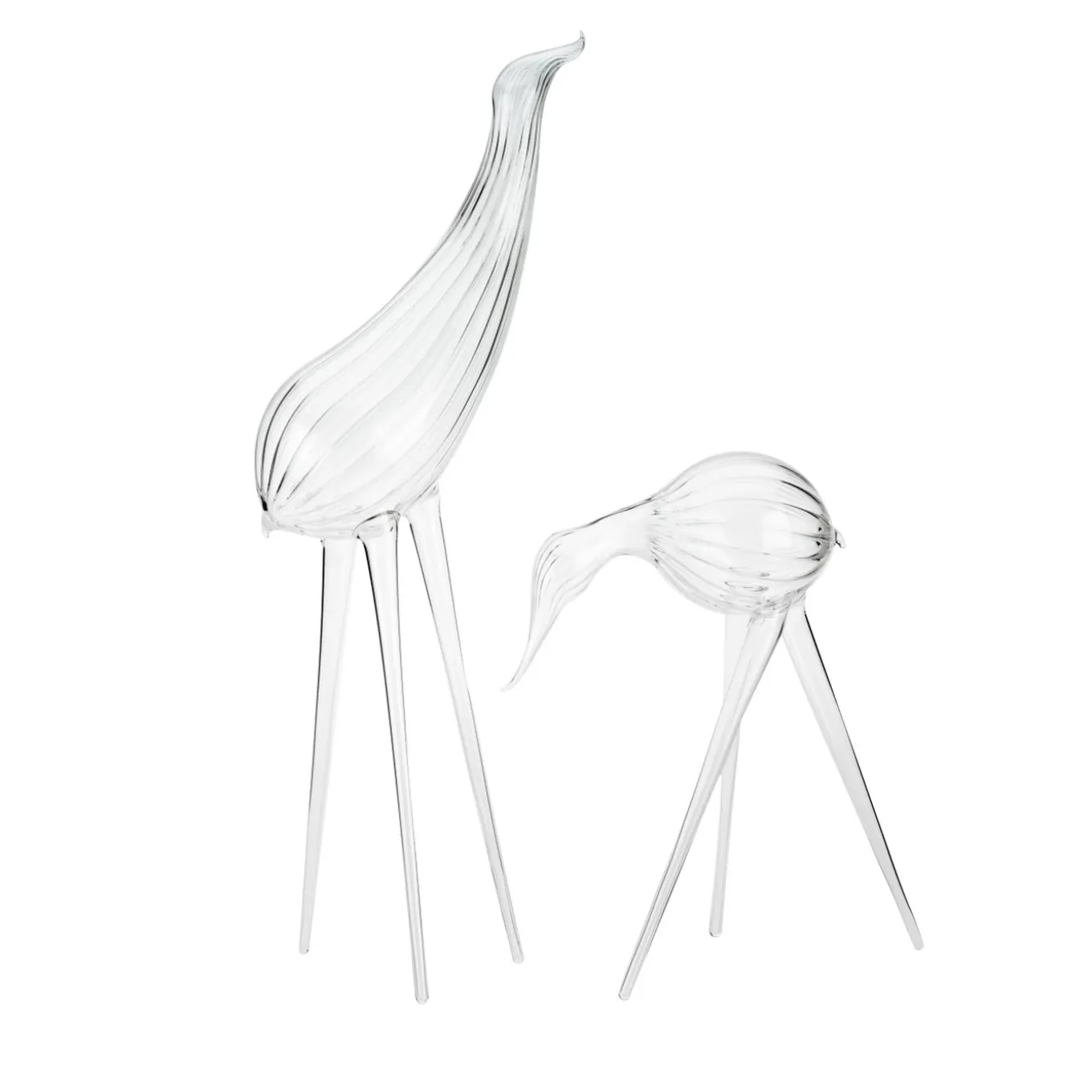 A superb decorative piece, this set of two sculptures was crafted by hand of mouth-blown glass made in Venezia. Two stylized birds appear in dynamic poses, standing on three legs and boasting vertical ridges on the surfaces of their bodies. One measures (in cm) 58 (h) x 26 x 20, the other 31 (h) x 25 x 18. Either on a console, mantelpiece, or bookcase, this set will be a playful and exquisite addition to a contemporary decor.
