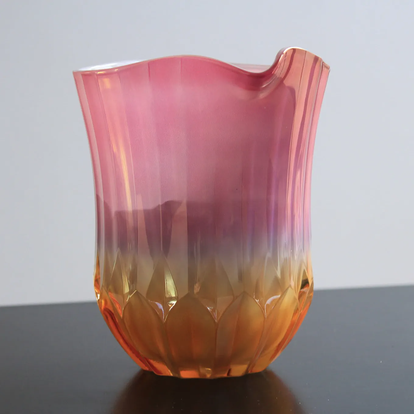 This captivating pitcher is a testament to glassmaking tradition and modern visual balance. Skillfully handcrafted of glass, it has a flared silhouette with a faceted, geometric base and vertically fluted sides that lead to a wide pouring rim and a curved handle. The white and orange color gradient of the glass pitcher elegantly contrasts with the multicolored glass handle, creating a dynamic color and textural contrast that gives the piece a unique, modern flair. This pitcher will add a refined touch of elegance for both everyday and festive table settings. It holds max 40 oz.