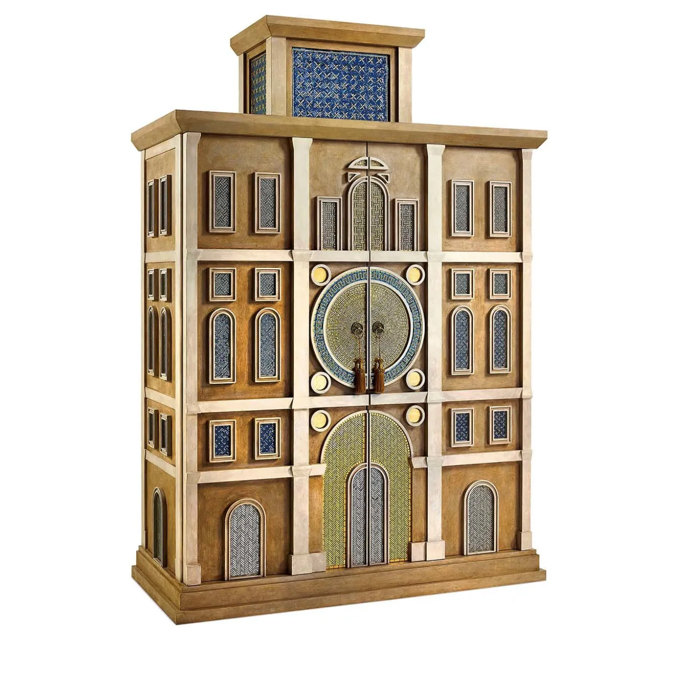 This wine cabinet is a masterpiece designed by Massimiliano Raggi and celebrates the stately elegance of the Italian Renaissance. The wooden structure with wax coating and hand-plastered finish is adorned with bronze, mirror glass, and hand-applied gold and platinum artistic mosaic. This exquisite work of art reproduces the exterior of the clock tower of Venice, with its harmonious volumes and precious allure. The interior is equipped with partitions upholstered in leather. The inside bar is optional, please inquire with the Concierge for details.