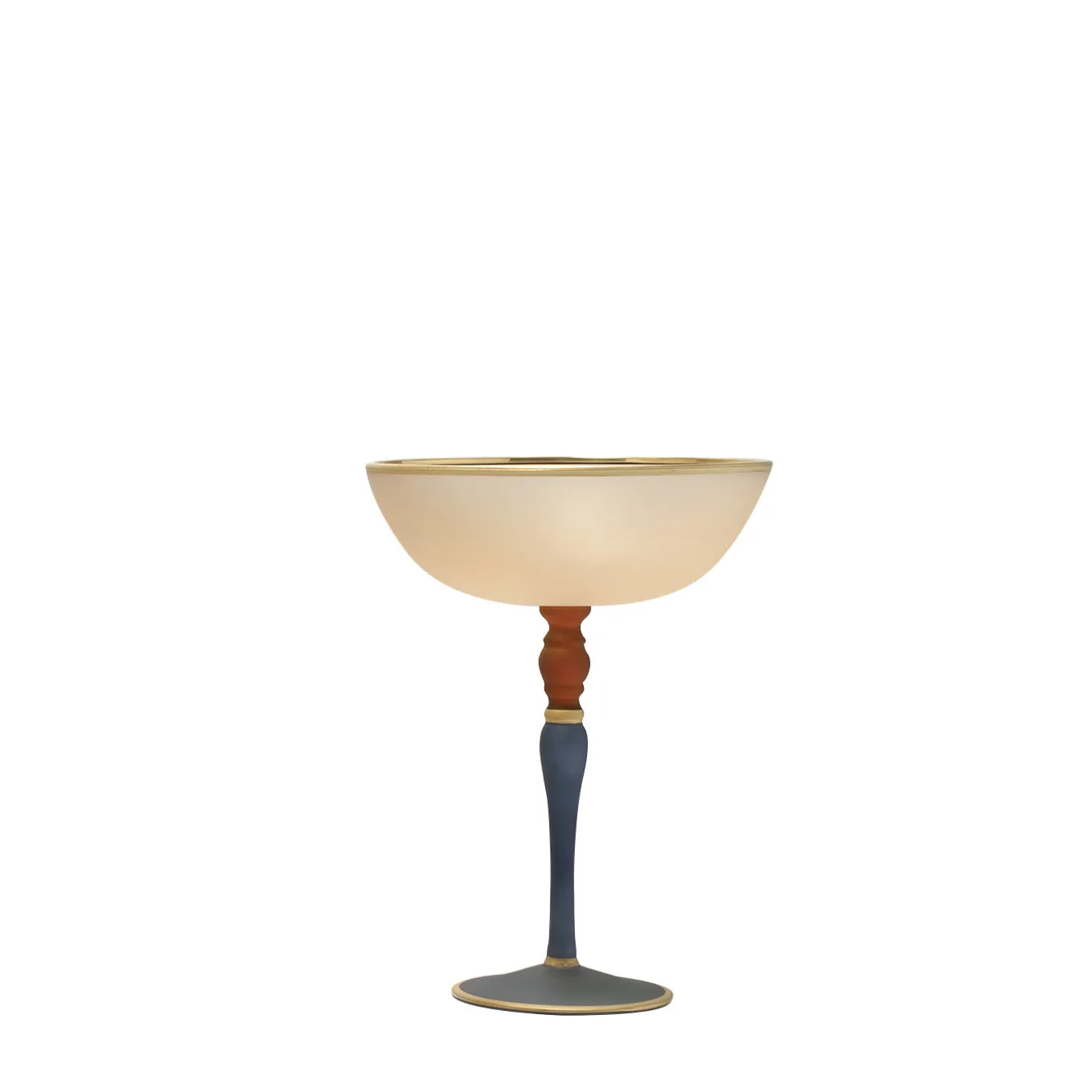 This cup is part of the Dolce Vita collection, made up of finely-crafted glass pieces that are painted by hand in delicate pastel colors and then given a matte satin finish with pure gold accents to make them precious objects of functional decor. The amber-colored cup rests on an elongated blue and red stem, supported by a pale blue round base, and can be used to store or display small objects, finger food, or even pot-pourri.