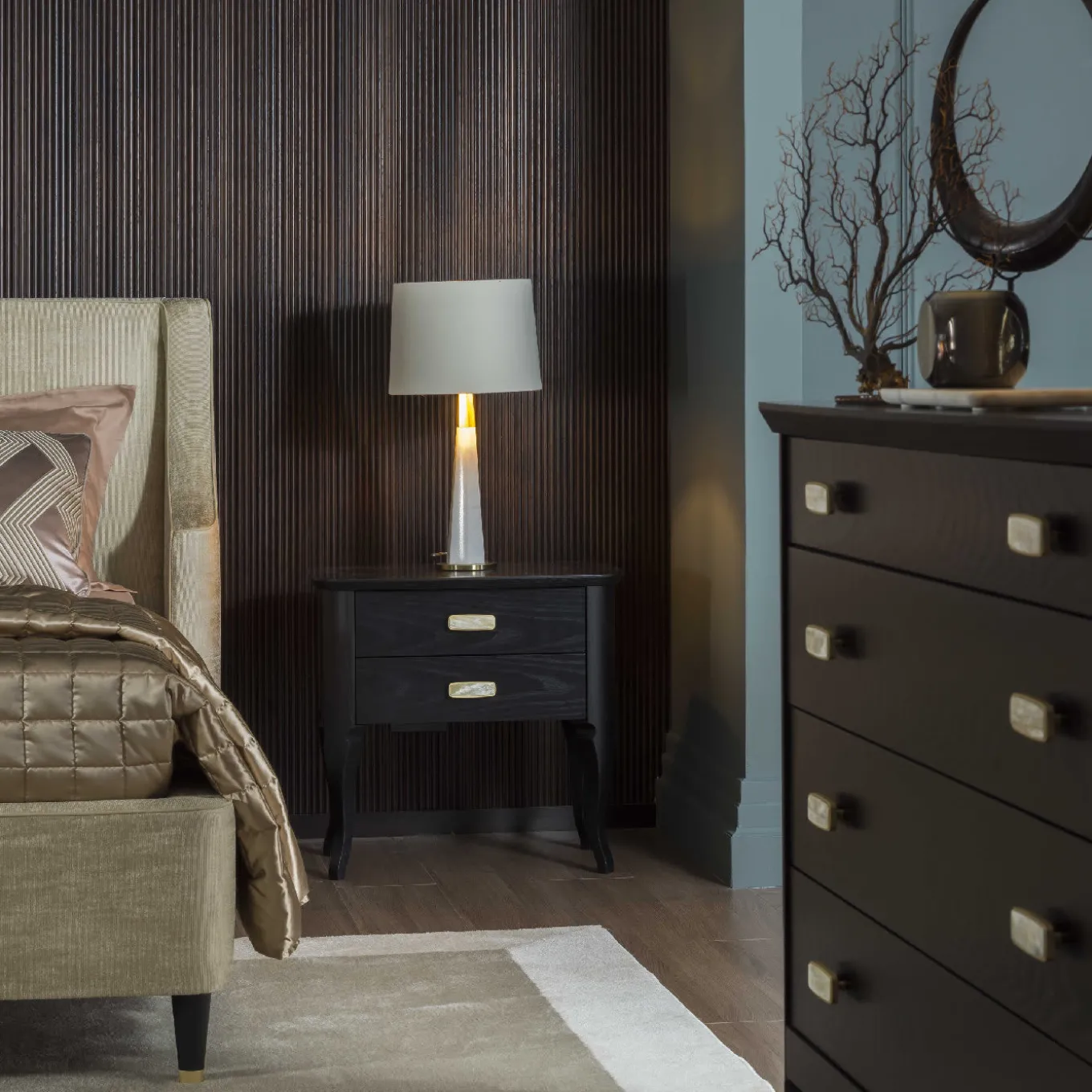 Combining the essential lines of mid-century design with exquisite craftsmanship, this nightstand is the perfect addition to a modern bedroom decor. The rectangular construction in ash-veneered wood stands on four cabriole legs features two drawers equipped with soft-close Blumotion technology. The front is accented with superb Art Deco handles made of brass with buffalo horn inserts that add a touch of luxury to the otherwise austere silhouette. The extended top with rounded edges provides a convenient surface to display books and other personal items.