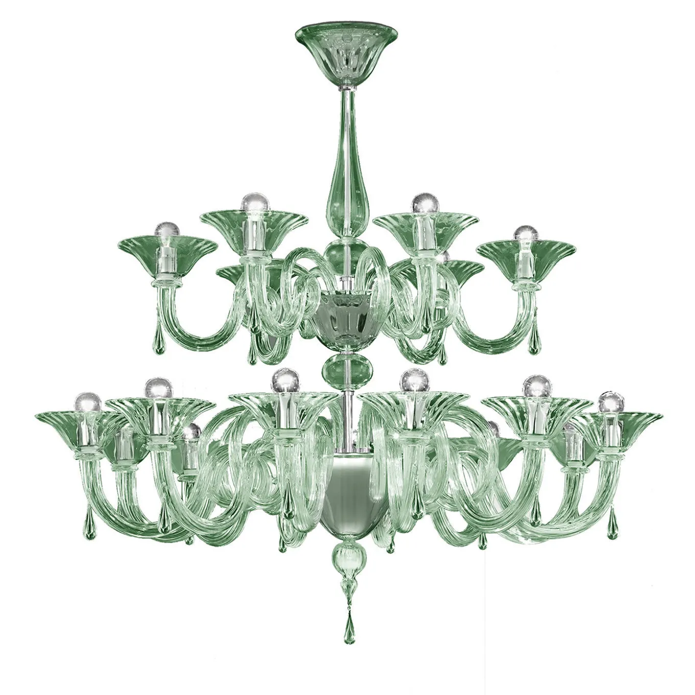 Marked by a symmetric and harmonious structure that revisits the traditional Venetian style with modern elegance, this sophisticated 18-light chandelier will infuse luxurious brightness into a large dining or living room. Covered entirely in green glass, the gold-finished structure features two tiers with decorative scrolls and arms extending in an upward curve, each holding a delicate flower-shaped bobeche. Illumination is provided by eighteen E14 max 42W light bulbs that generate alluring reflections when interacting with the gold metal details and green glass.