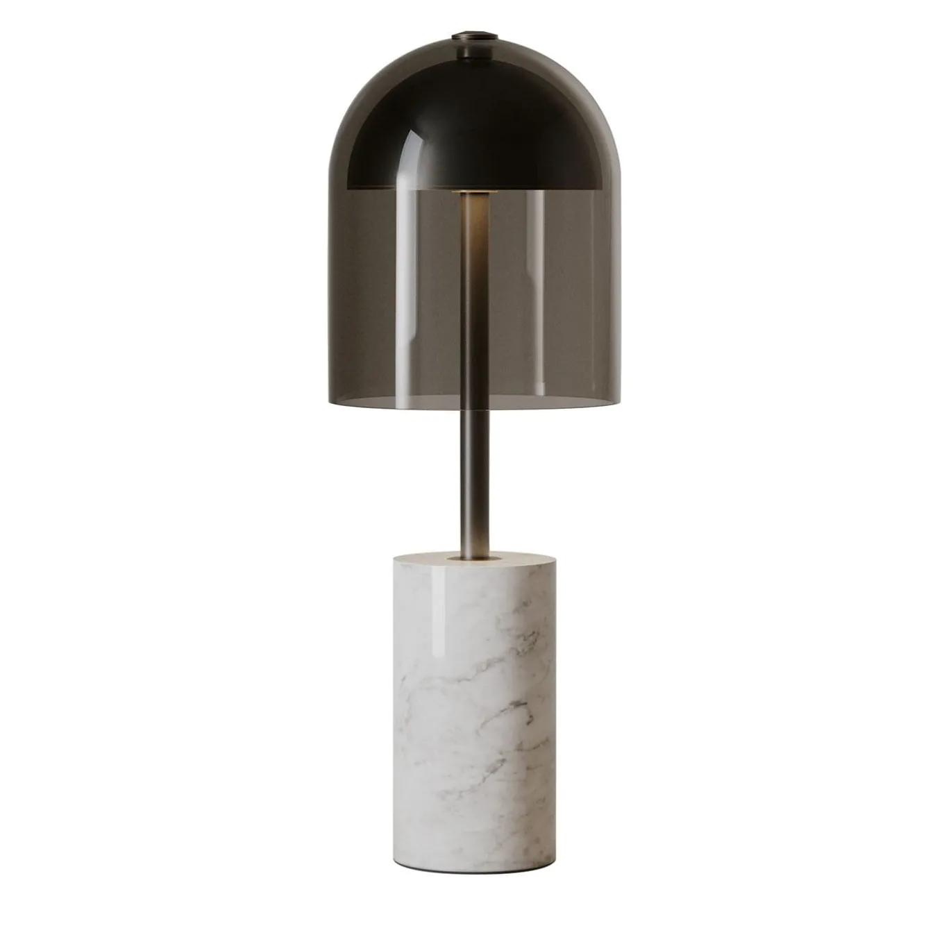 The Doma table lamp features a white Carrara marble base paired with a dark burnished brass frame and a smoke gray glass shade. This design combines solid marble with finely finished metal and tinted glass to create a sophisticated ambient light source. Ideal for indoor use, delivering both style and function. Available in multiple finish and glass color variations, contact the Concierge for further information. Bulb inclueded. Designed by Massimo Tonetto.