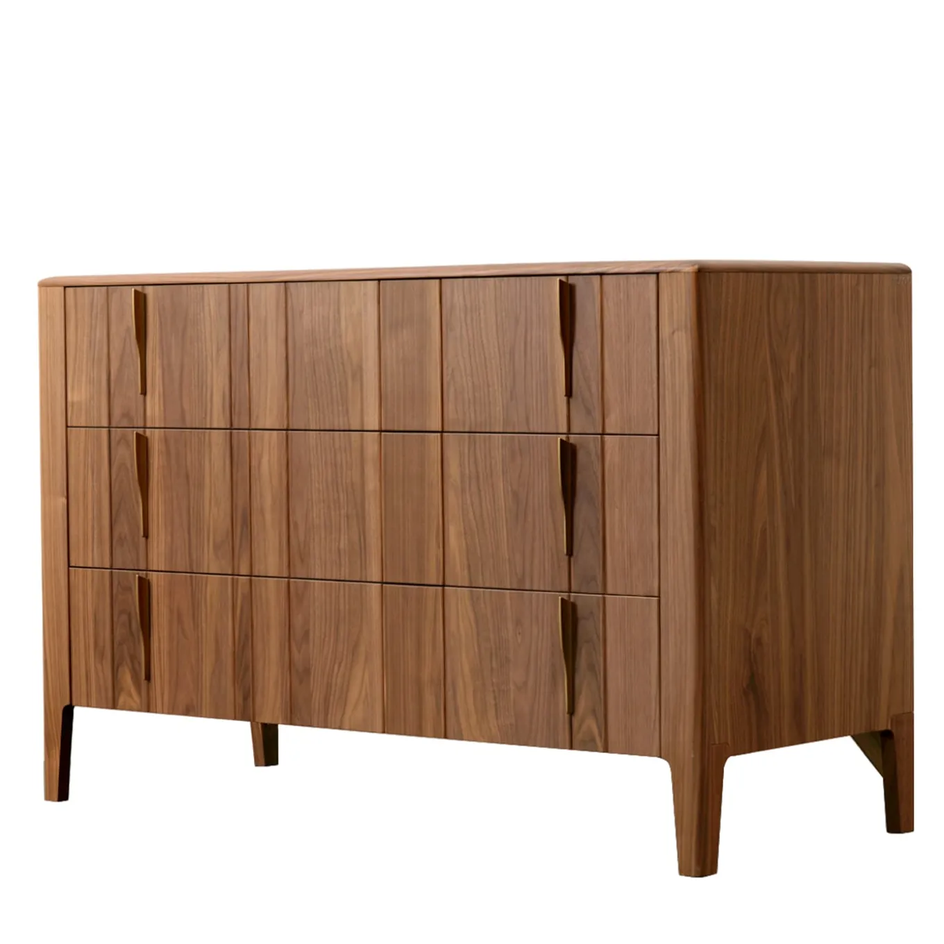 This dresser is crafted entirely from canaletto walnut wood, finished with an eco-friendly water-based varnish in Havana Oil. It features three wooden drawers with a distinctive solid walnut slat front, and the interior is painted in a light wood finish. The drawer guides are smooth and soft-closing for easy use. For the handles, bronze metal accents are used, adding a touch of elegance to the piece.