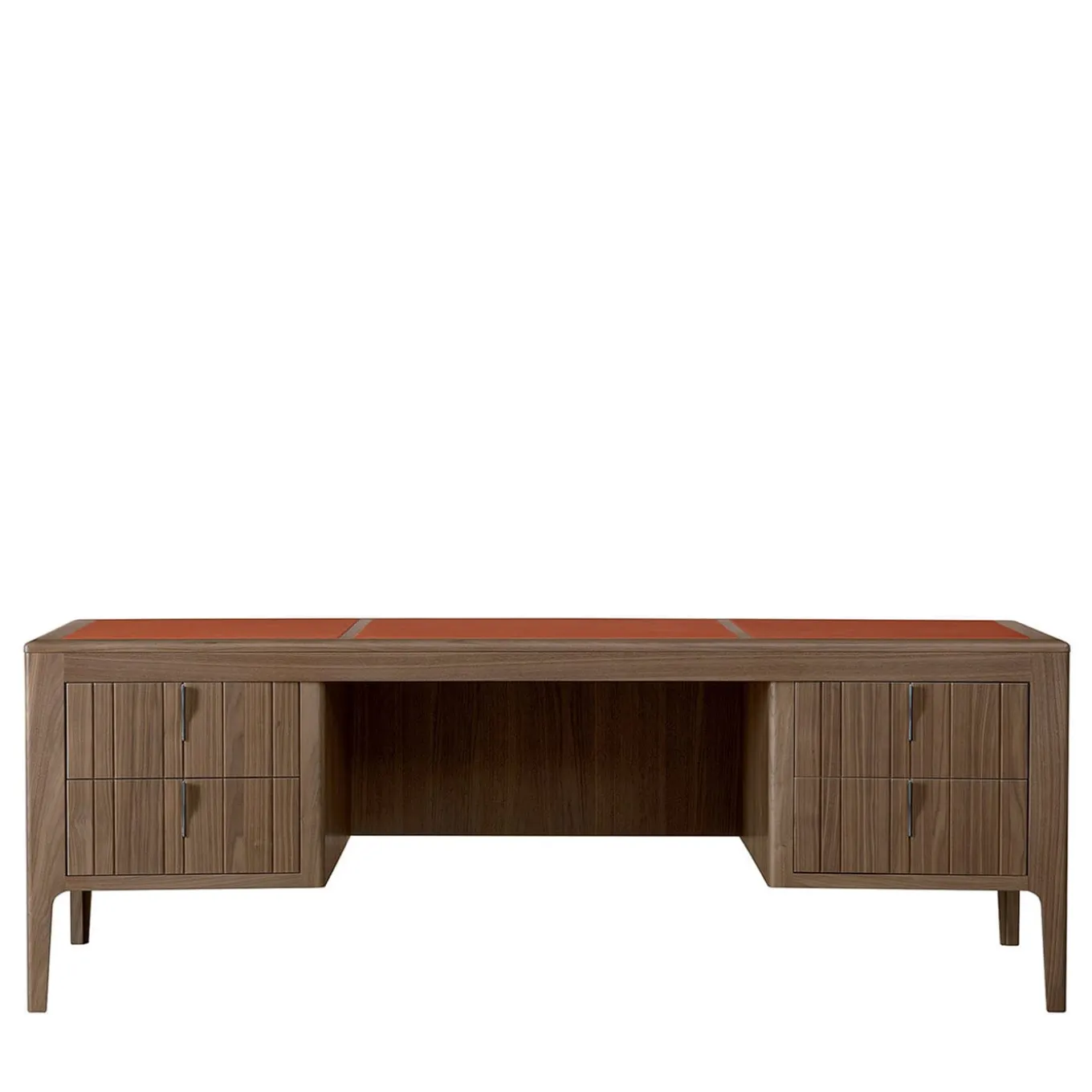 Curved version writing desk with four drawers in Canaletto Origine wood and leather top.