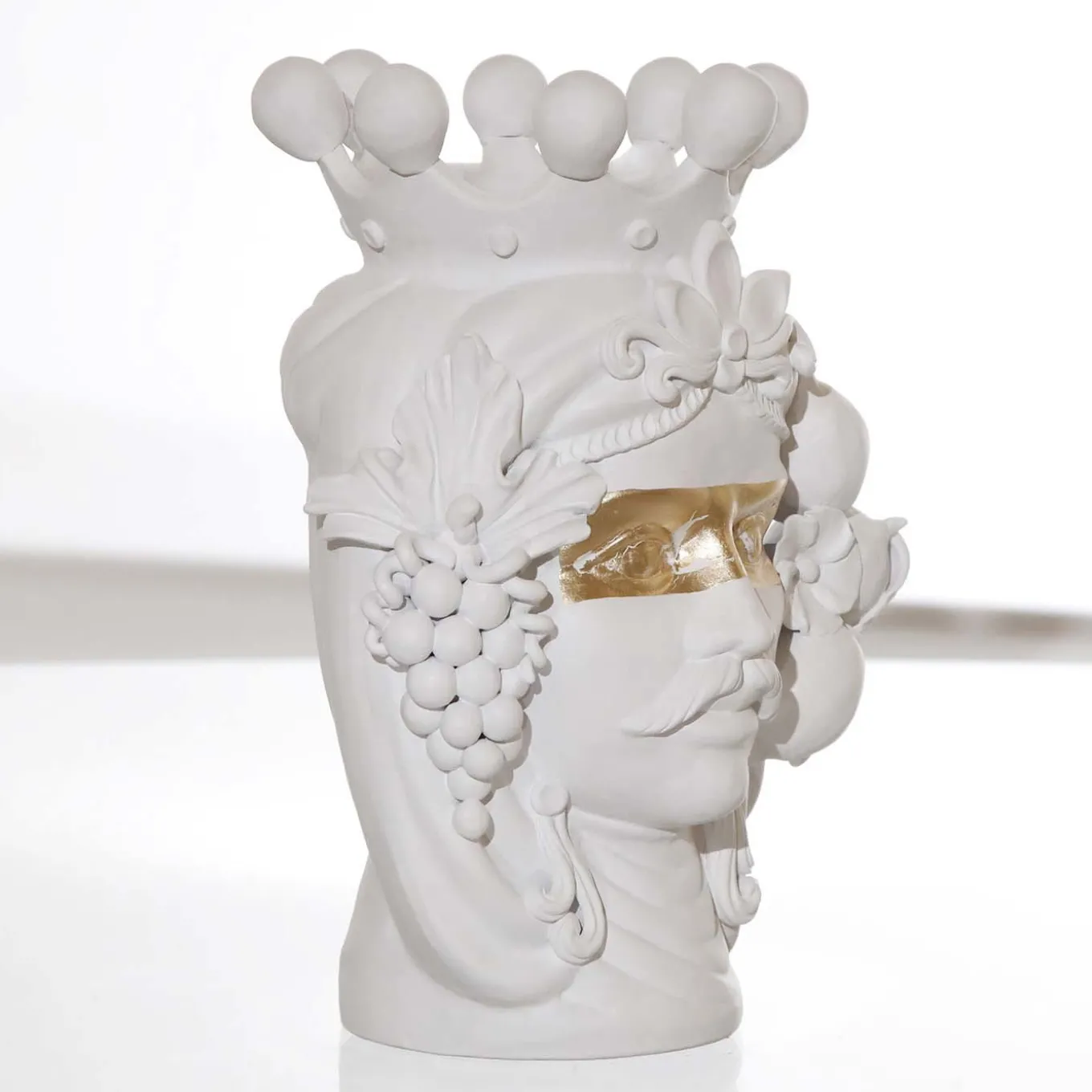 Stately yet bold, this alluring, anthropomorphic vase of a man is a testament to Sicily’s rich artistic and historical heritage. Crafted using terracotta with a matte white glaze, the sculpture of a Moor man boasts meticulous detailing “en relief” that reveals the grape and floral locks of hair, striking mustache, and supple turban topped by a regal crown. The expressive gaze is accomplished by applying a gold leaf stripe across the eyes, emphasizing their vibrant symbolism as windows to the soul. The piece will make a statement in a living room, patio deck or entryway. The vase cannot be filled with water.