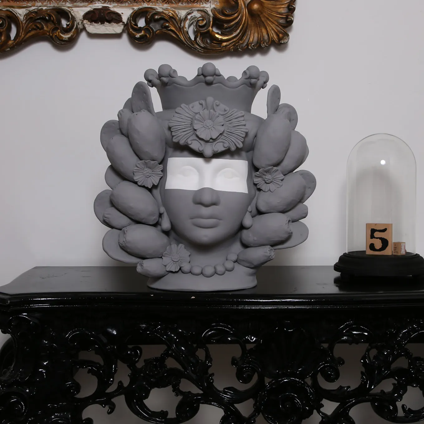 Exuding traditional grandeur and beauty, this exceptional Moorish vase of a woman is crafted in the ancient Sicilians terracotta tradition. The anthropomorphic vase is exceptional in the details, revealed in the ornate lemon headdress that elegantly frames the woman’s sumptuous visage. Handpainted in a matte grey glaze, this piece boasts a white band across the eyes, a modern touch that accentuates the drama of the vase. The vase cannot be filled with water.